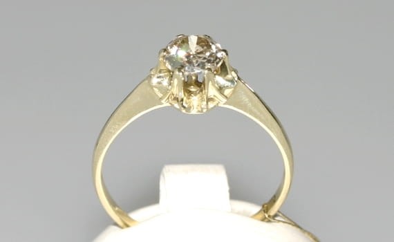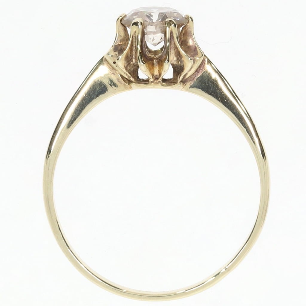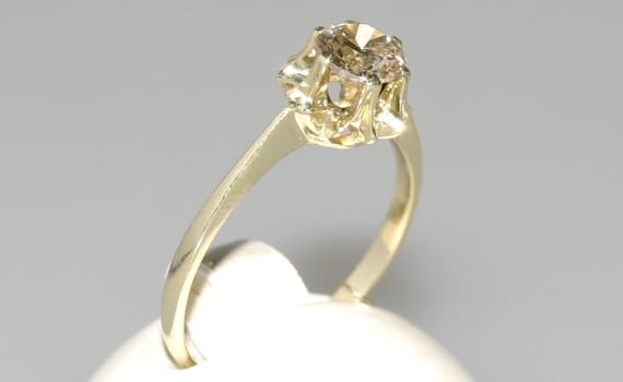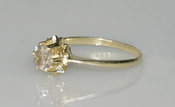 Klasyczny pierścionek z żółtego złota z diamentem o szlifie brylantowym oprawionym w łapki. Patrząc na ten pierścionek z boku, można zobaczyć piękną koronę, jaką tworzą łapki trzymające diament. Wprost wymarzony pierścionek zaręczynowy.