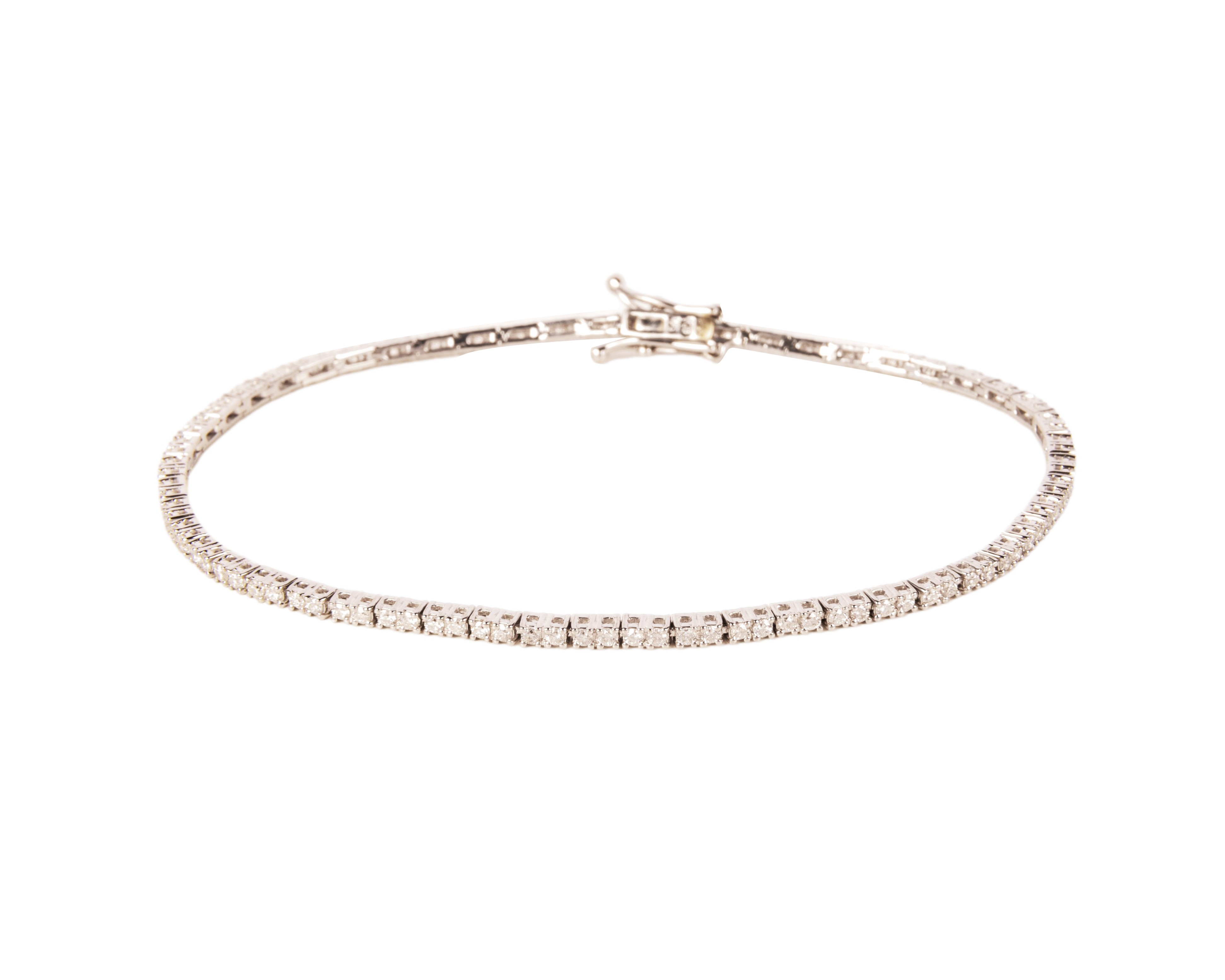Bransoletka w typie tenisówki, wysadzana 106 diamentami o łącznej masie ok. 1,60 karata, czystości Si i barwy G-H. Bransoletkę wykonano z białego złota wysokiej próby 2, tj. 750, na długość 18 cm. Zapięcie to klasyczna szufladka z dwoma bocznymi ósemkami - zabezpieczającymi przed przypadkowym odpięciem.