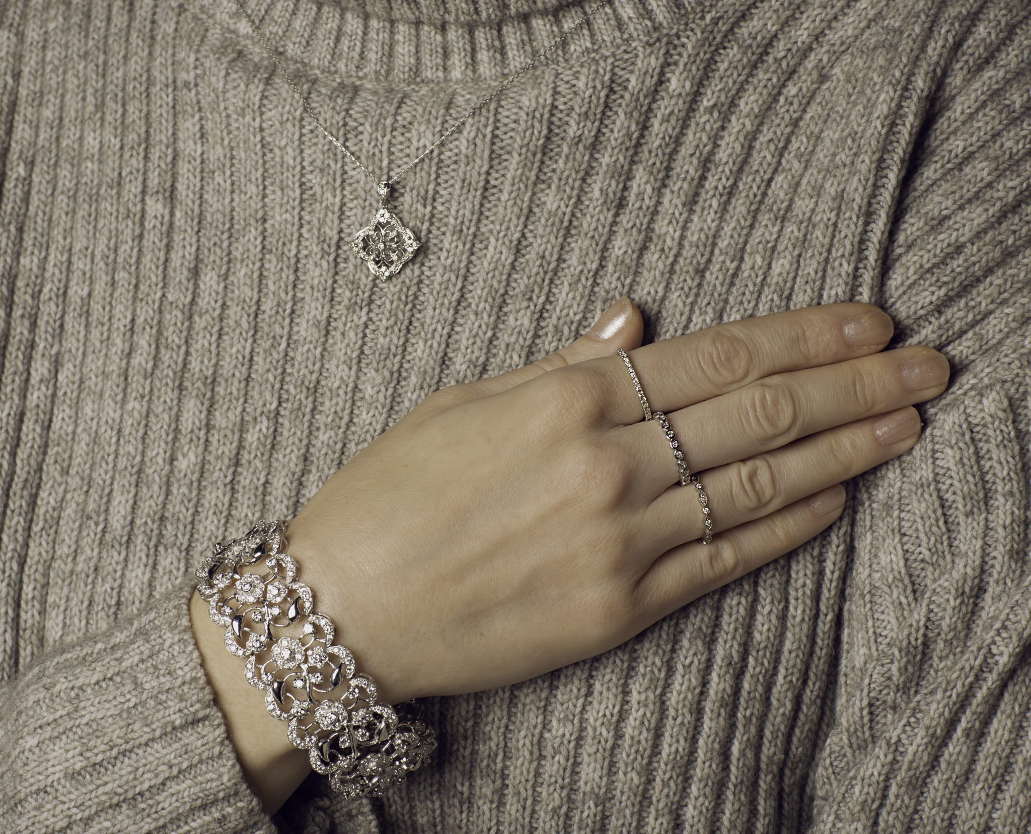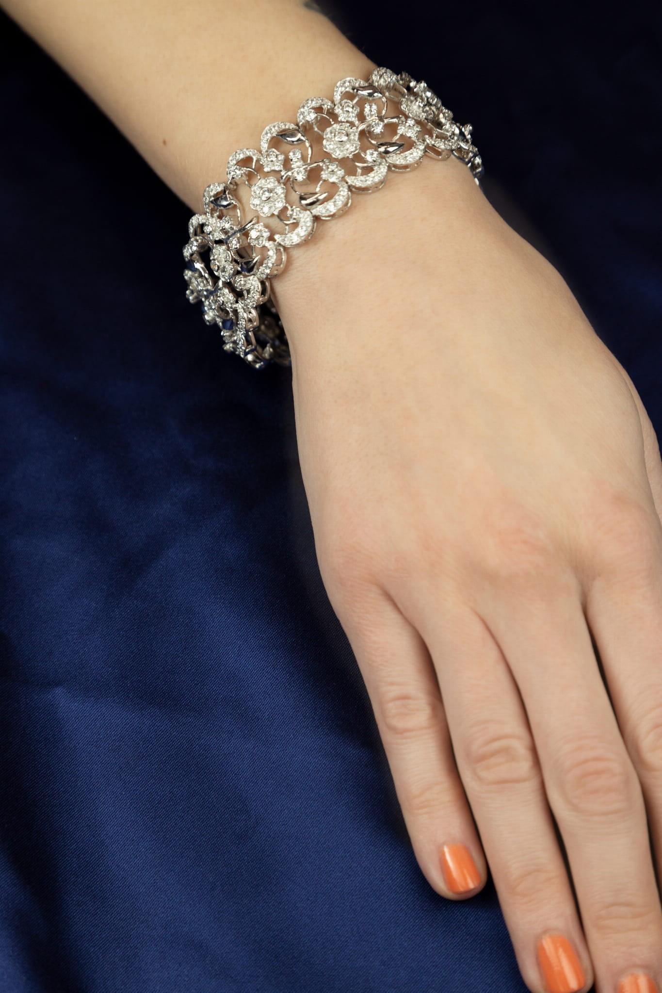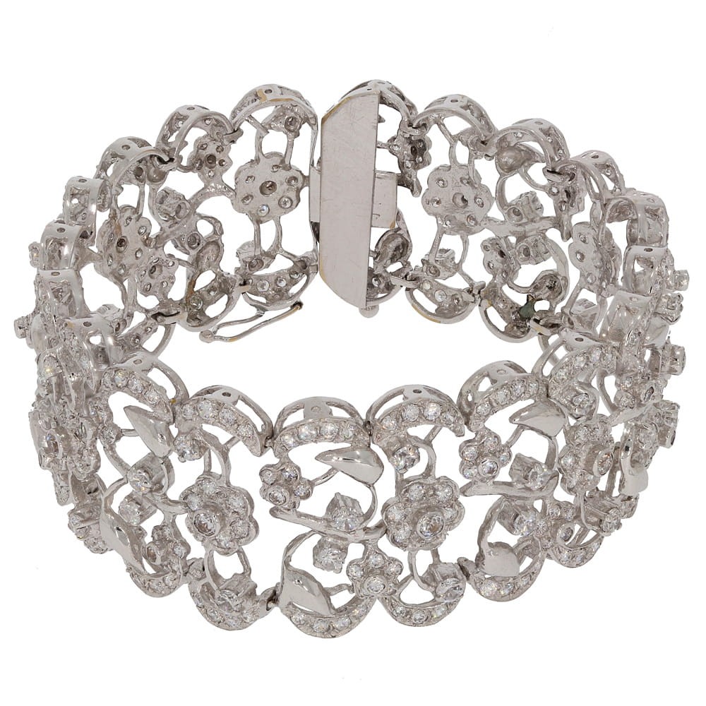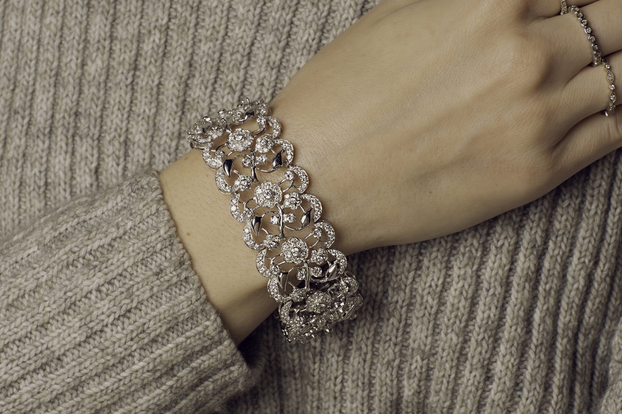 Bransoletka z białego złota składająca się z wielu elementów z motywami roślinnymi, ozdobiona licznymi cyrkoniami. Klasyczna propozycja dla wielbicieli przyciągającej wzrok biżuterii.