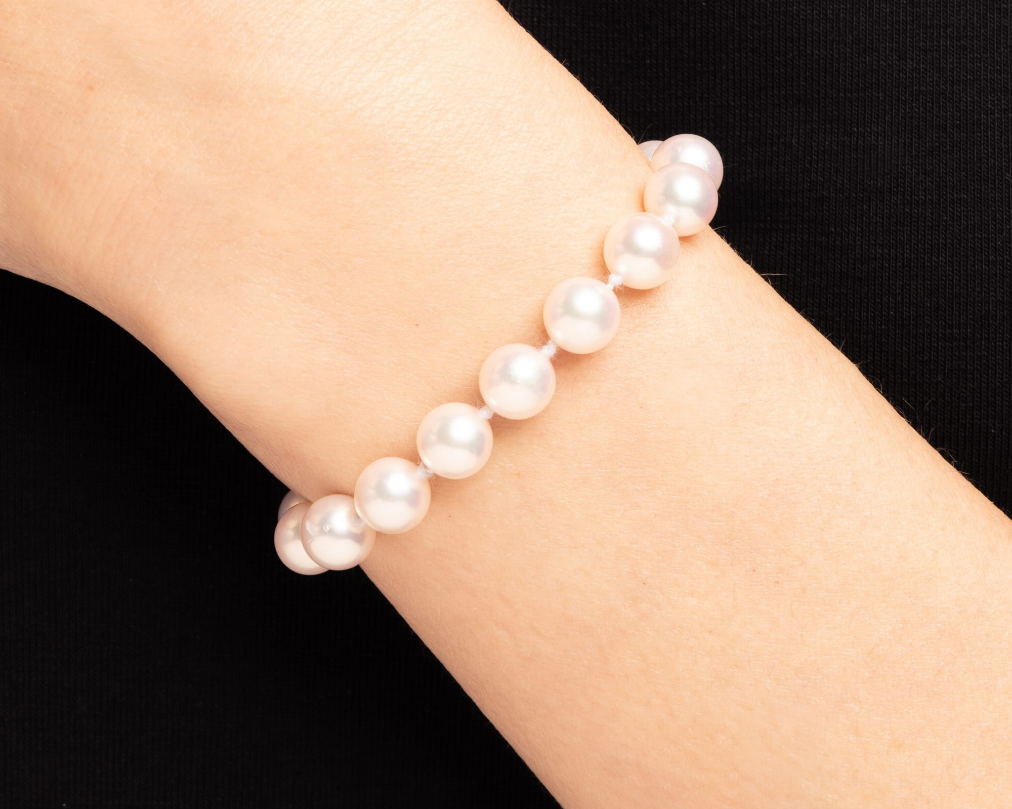 Jednorzędowa bransoletka z morskich pereł i zapięciem z białego złota z diamentami. Wyrób posiada świadectwo badania z Urzędu Probierczego, według którego zapięcie wykonano ze złota próby 585, oploty w bransoletce z metalu.