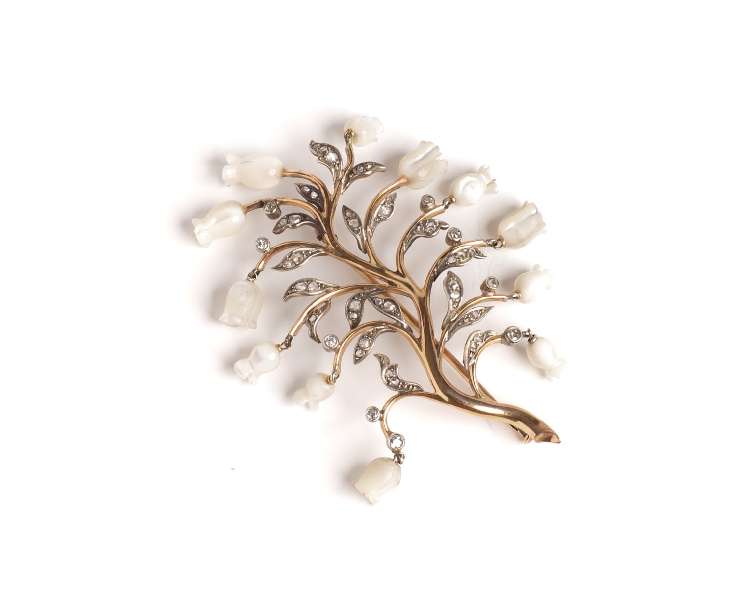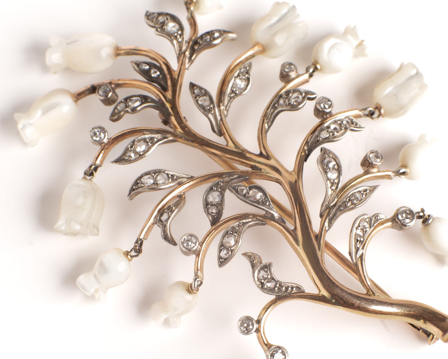 Przepiękna broszka dla wszystkich fanów florystyki! W nietypowym kształcie kwiatu konwalii. Wykonana ze złota, masy perłowej oraz diamentów.
