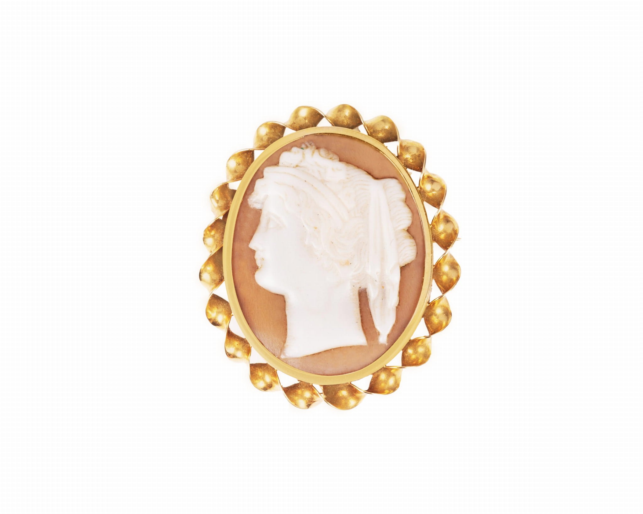 Złota broszka z kameą oprawiona w złoto, całość ma wymiary ok. 3,2 x 2,7 cm.