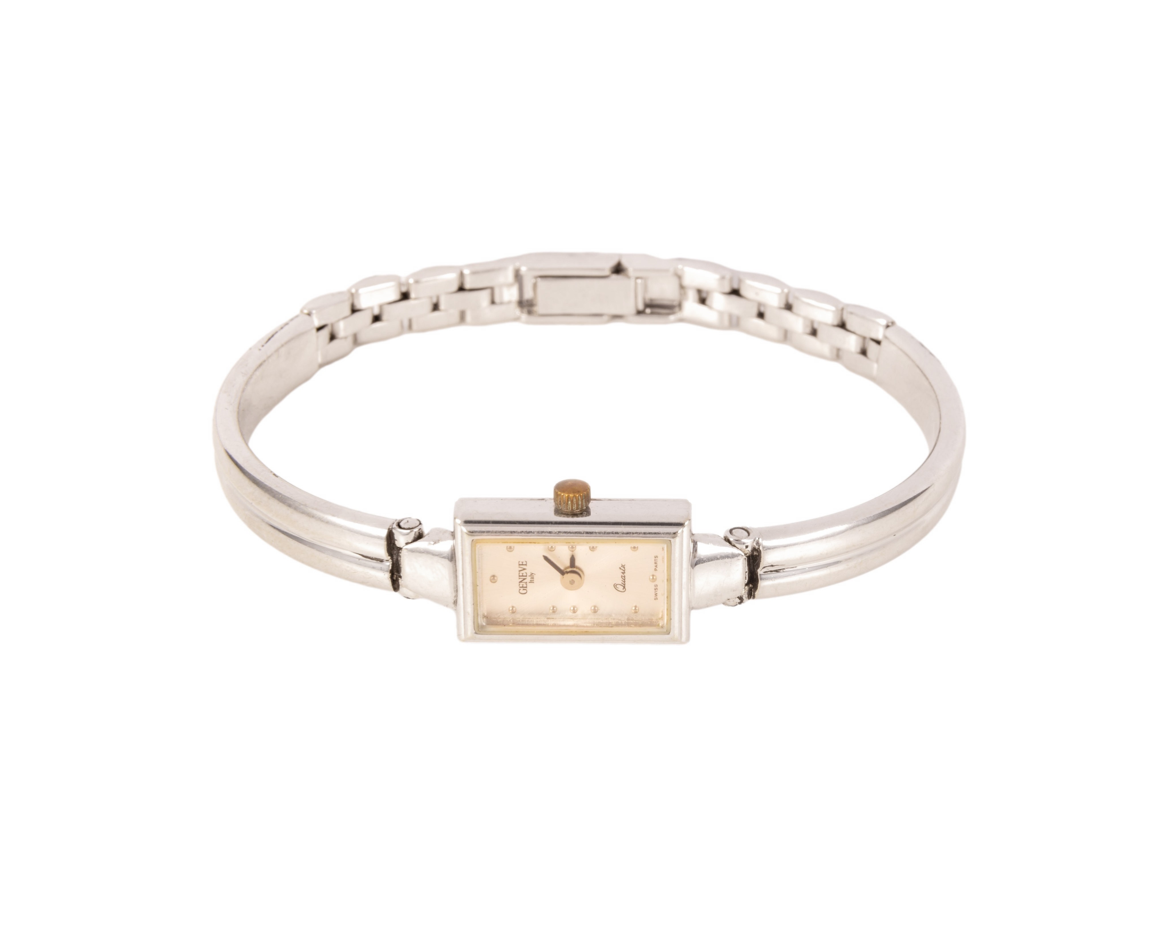 Damski zegarek kwarcowy na częściowo sztywnej bransolecie (oprócz fragmentu z zapięciem), z prostokątną tarczą. Idealny prezent dla eleganckiej kobiety ceniącej sobie prostotę i szlachetność materiałów. Zegarek kwarcowy, sygnowany marką Geneve Italy. Zrobiony z białego złota próby 3, tj. 585.