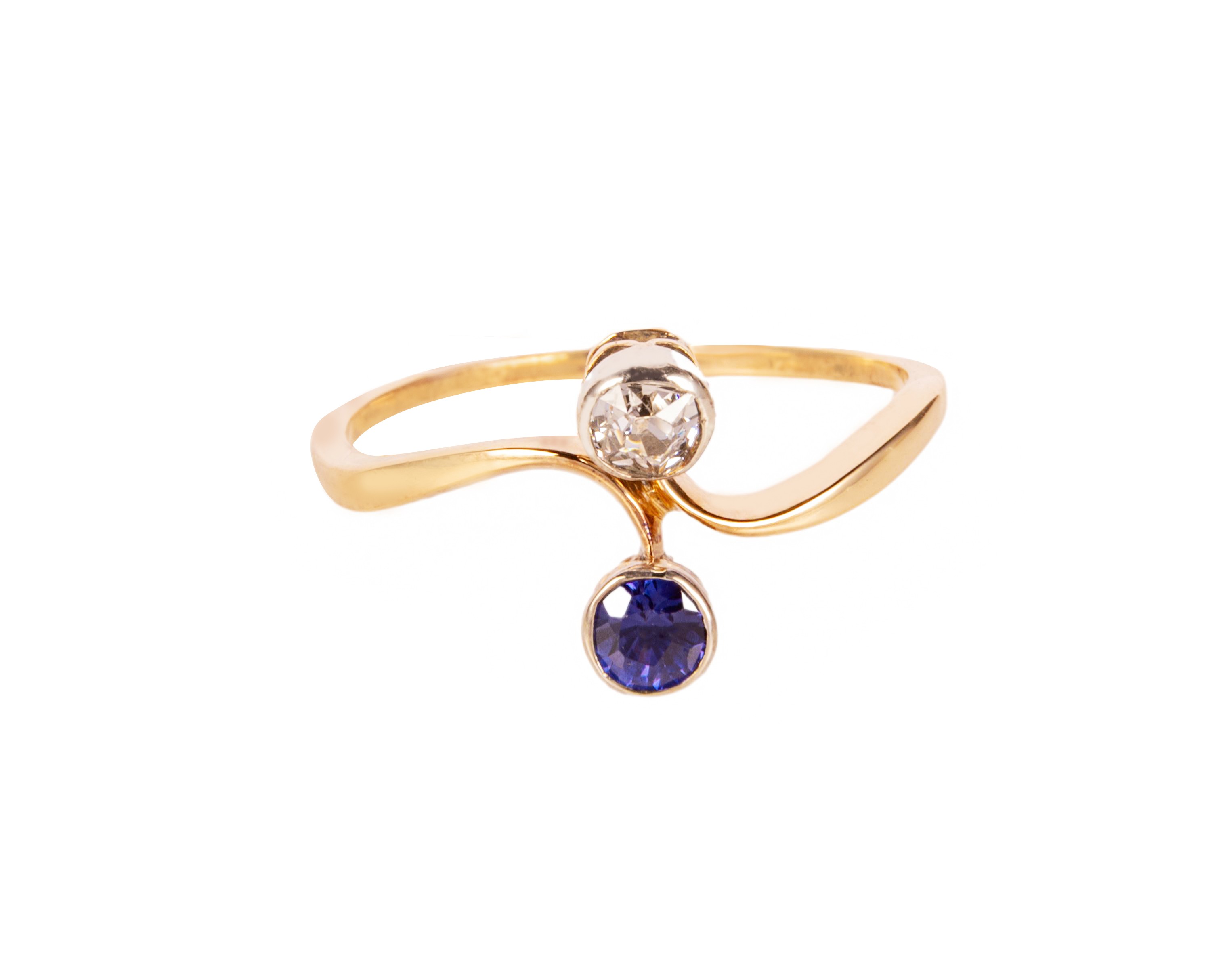Delikatny pierścionek wykonany z połączenia złota i srebra, z dwoma kamieniami - szafirem i diamentem. Ten drugi ma masę ok. 0,10 karata, czystość VS oraz barwę G. Pierścionek ma rozmiar 9 (zapytaj o możliwość zmiany rozmiaru).