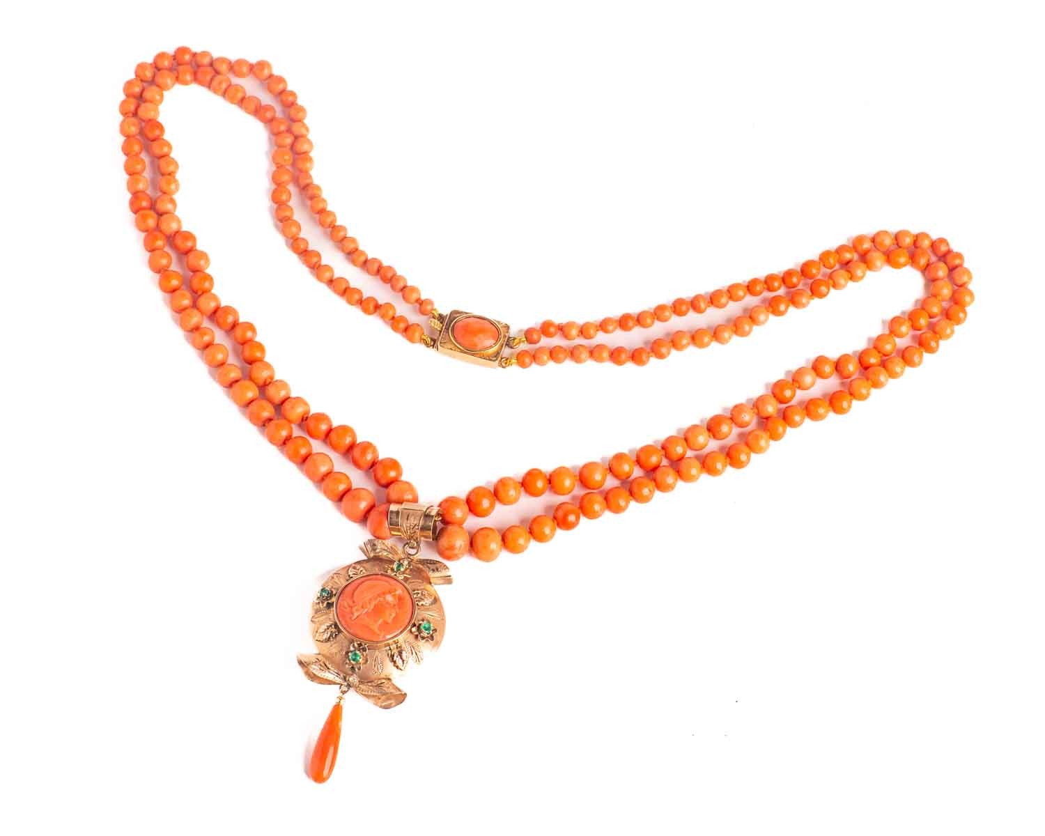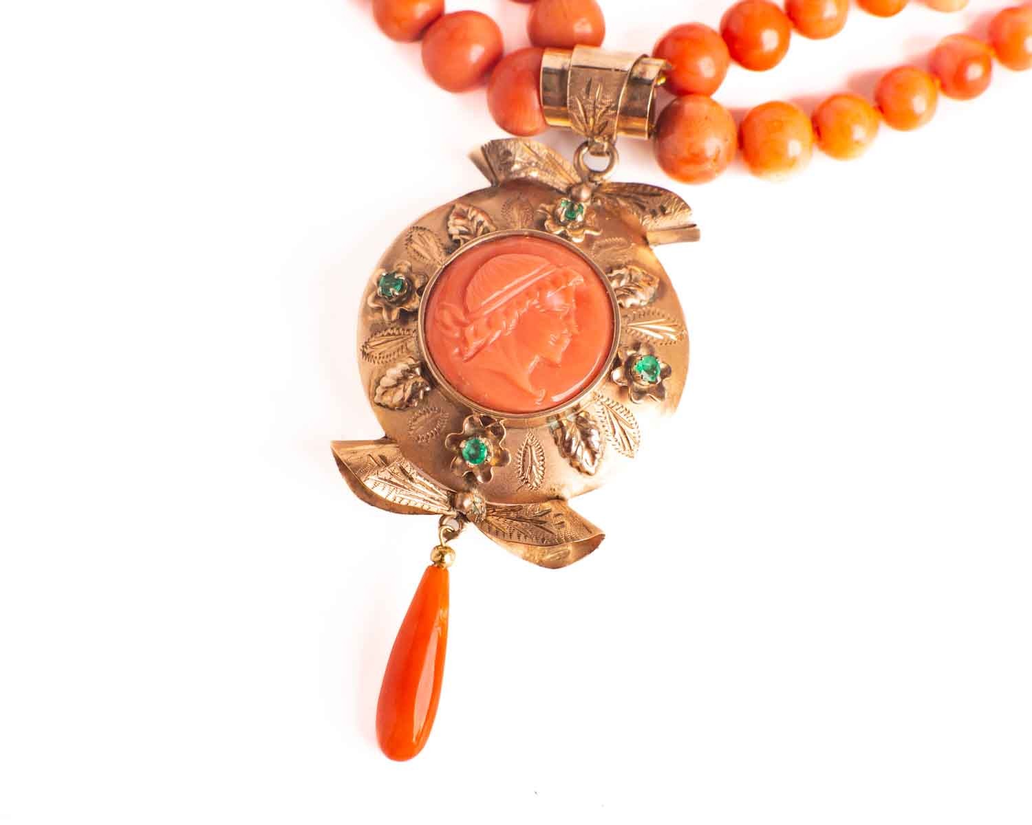 Piękne połączenie kolorystyczne - czerwień korali i zieleń szmaragdu. Dwurzędowe korale ładnie się układają. Dodatkowa kamea nadaje charakter tej biżuterii.