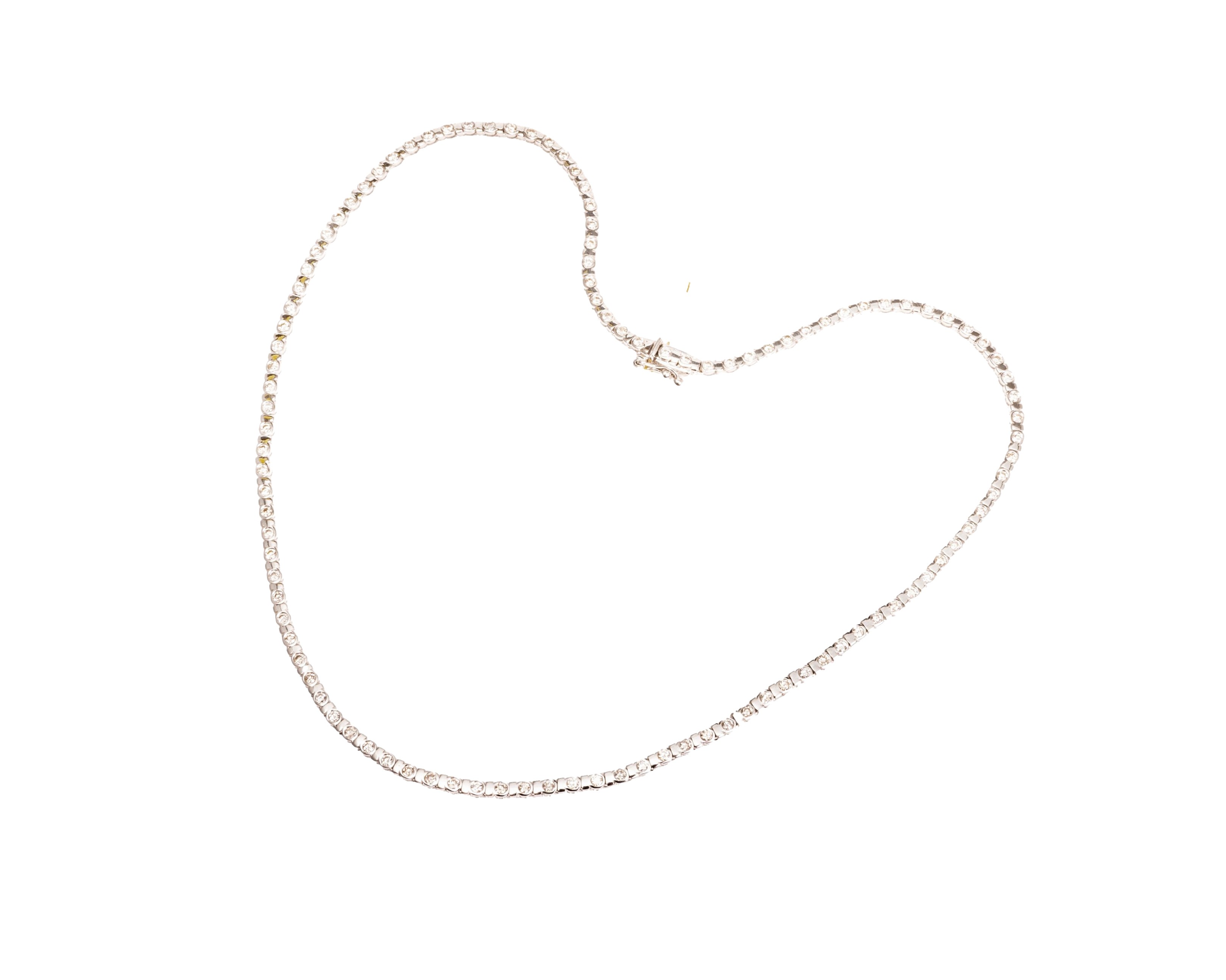 Naszyjnik w białym złocie wysokiej próby 750, wysadzany diamentami o łącznej masie ok. 3,24 karata, czystości VS-Si oraz barwie w przedziale od H do J. Naszyjnik zapinany na klasyczną szufladkę z boczną ósemką zabezpieczającą przed przypadkowym odpięciem się naszyjnika. Całość ma długość ok. 43 cm.