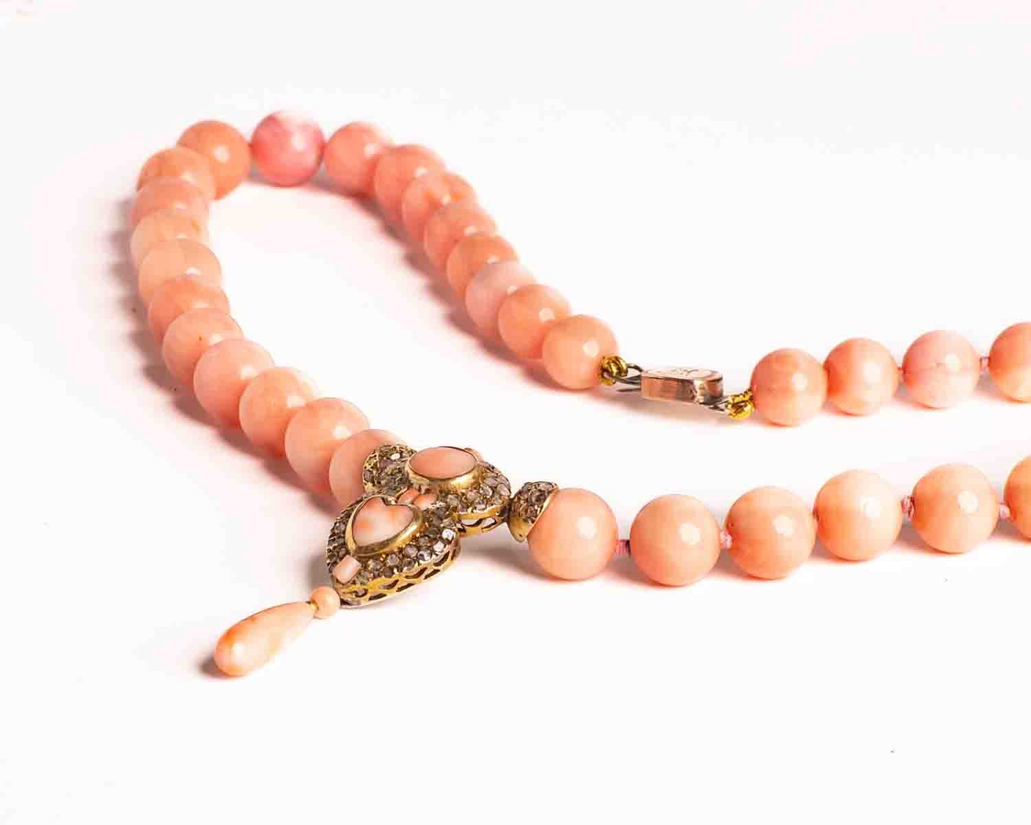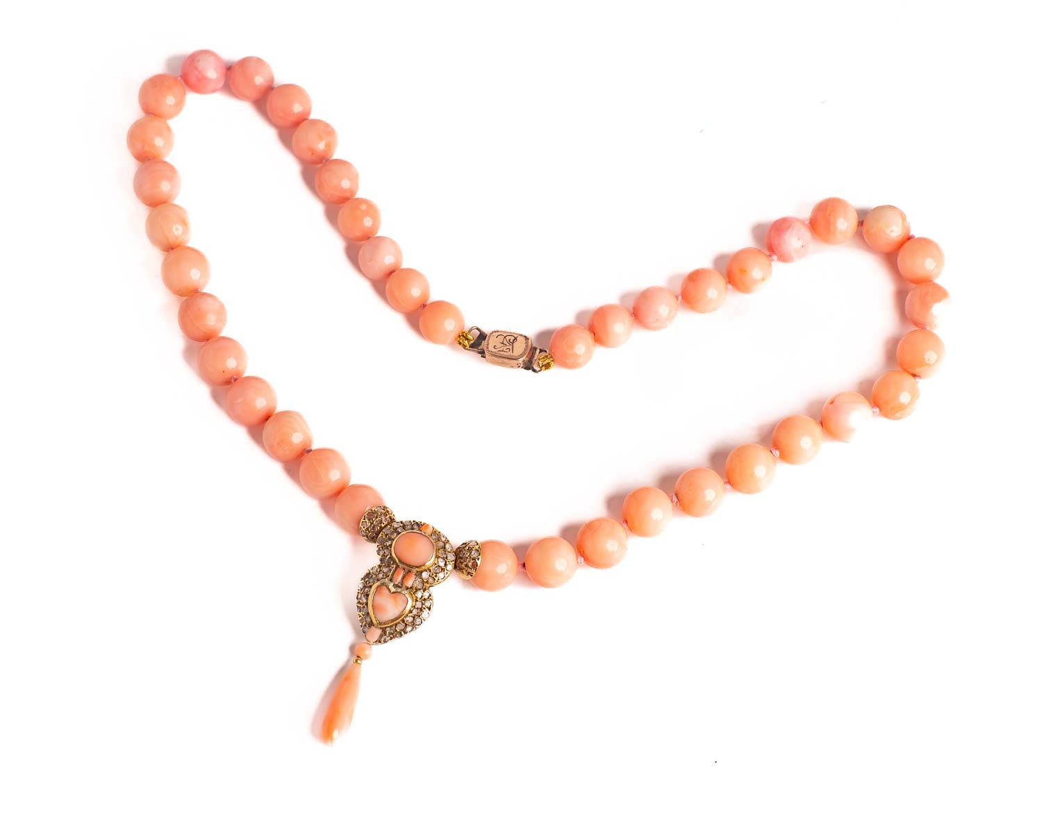 Naszyjnik z rzadko spotykanych jasnoróżowych korali. Z wiszącymi ozdobami z rautów diamentowych i korali.