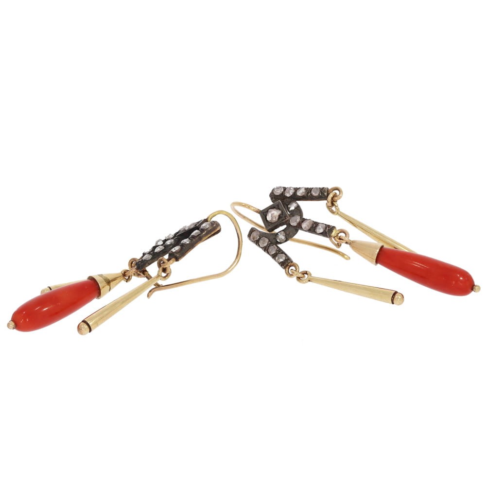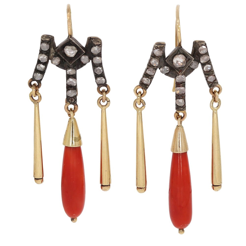 Wiszące kolczyki z żółtego złota i srebra ozdobione rozetami diamentowymi, oraz koralami w kształcie sopli. Biżuteria nada niepowtarzalnego charakteru każdej stylizacji.