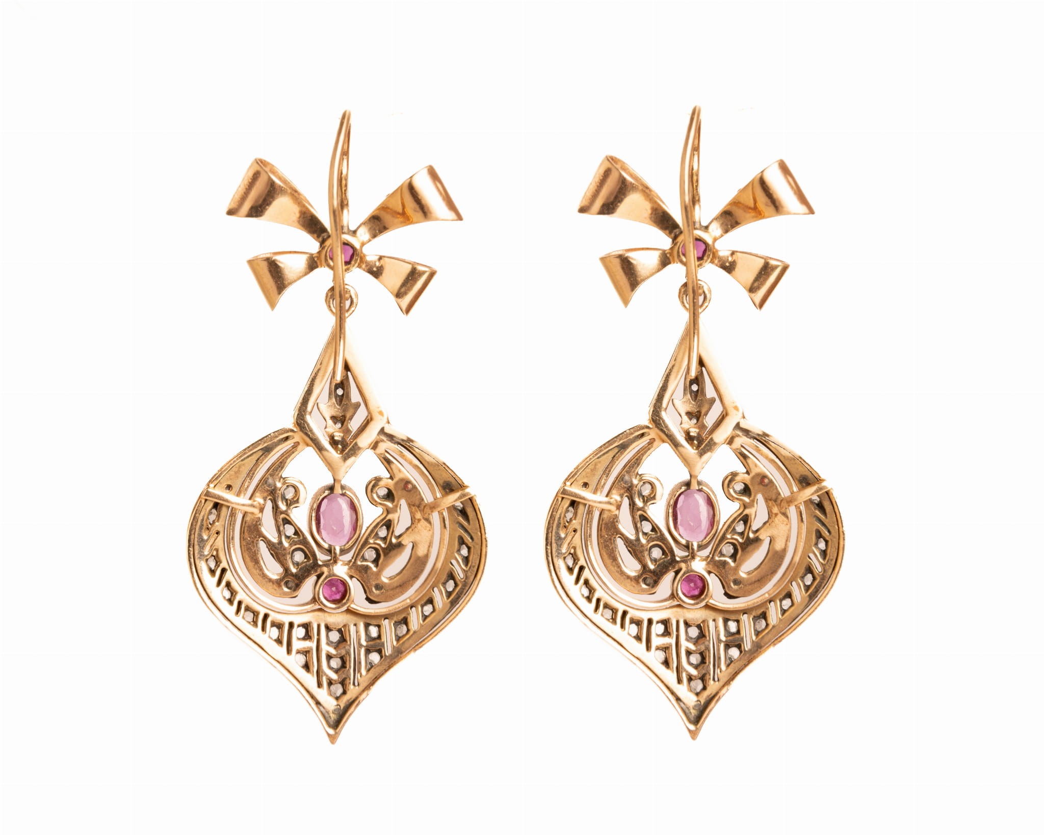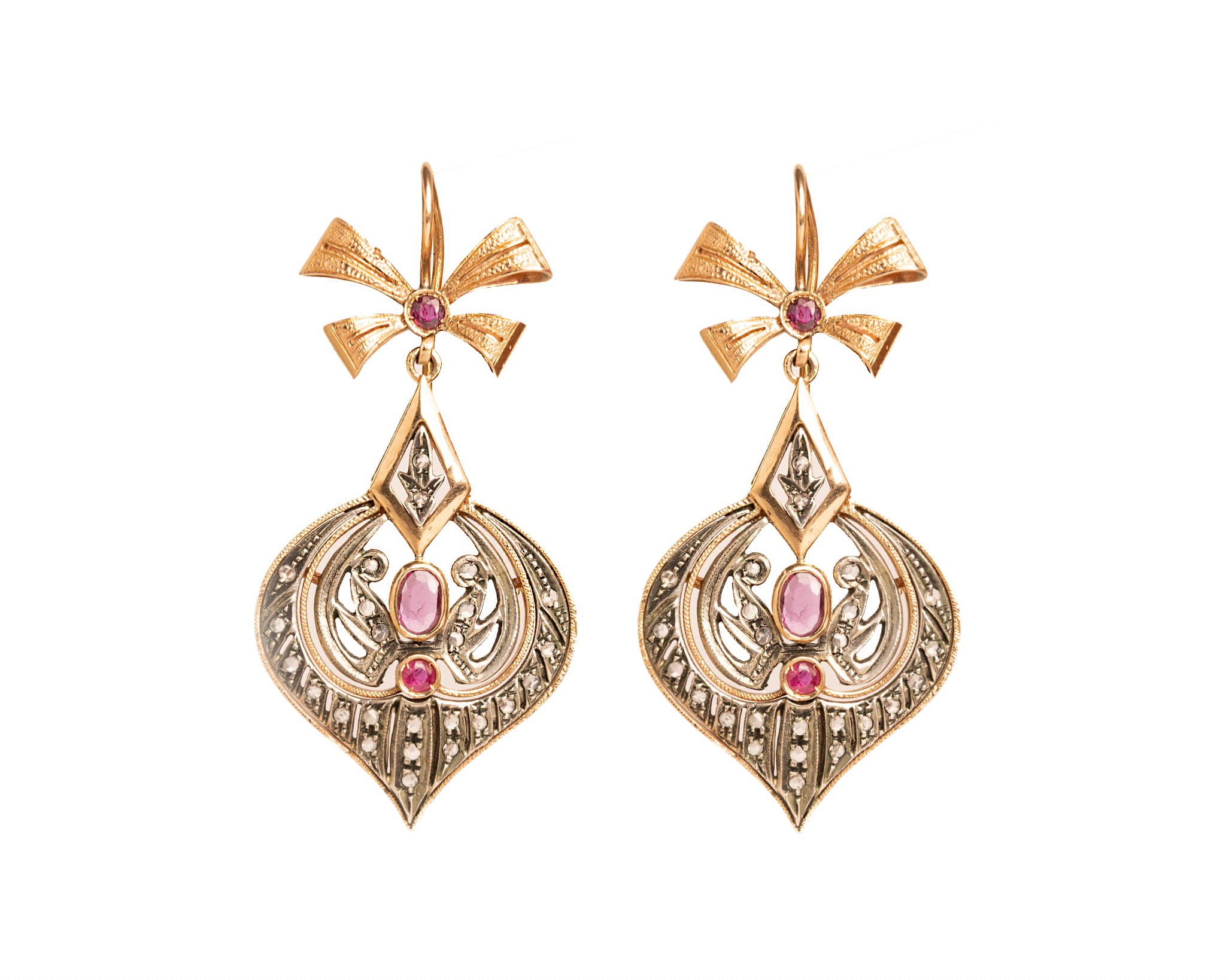 Para wiszących kolczyków, wysadzanych rubinami i rozetami diamentowymi. Niezwykle ozdobny wyrób z motywem kokardy. Całość wykonana z połączenia złota i srebra.