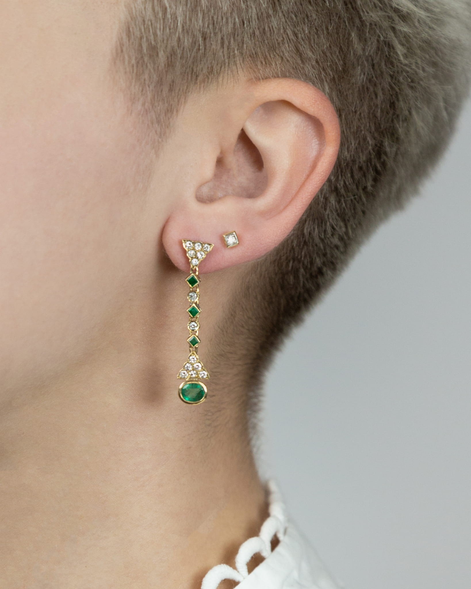 Fantazyjne kolczyki ze szmaragdami i z diamentami wykonane ze złota w próbie 2. Wieloelementowe, wiszące kolczyki idealnie łączą w sobie styl i elegancję. Doskonałe kolczyki dla kobiet lubiących niebanalne dodatki. Zapięcie na sztyftach.