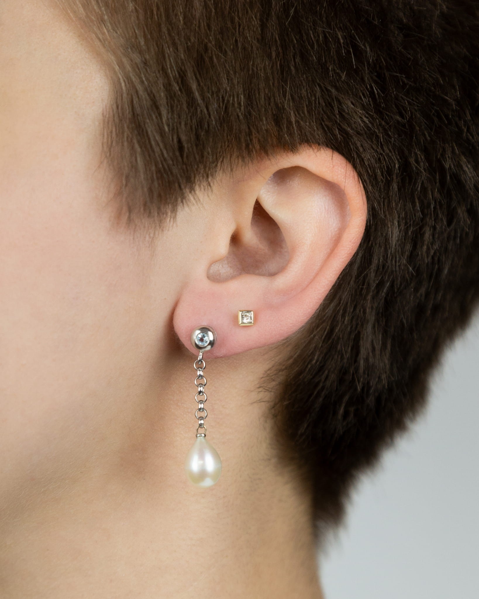 Górną część każdego kolczyka stanowi dyskretna, okrągła sztyfta z białego złota, w centrum której osadzony jest drobny akwamaryn w oprawie obejmującej. Kamień w lodowo-błękitnej tonacji połyskuje delikatnie przy uchu – nie dominuje, lecz sygnalizuje swoją obecność z klasą. To właśnie taki detal odróżnia biżuterię wysokiej jakości od zwykłej ozdoby: mały kamień we właściwym miejscu potrafi zmienić wszystko.