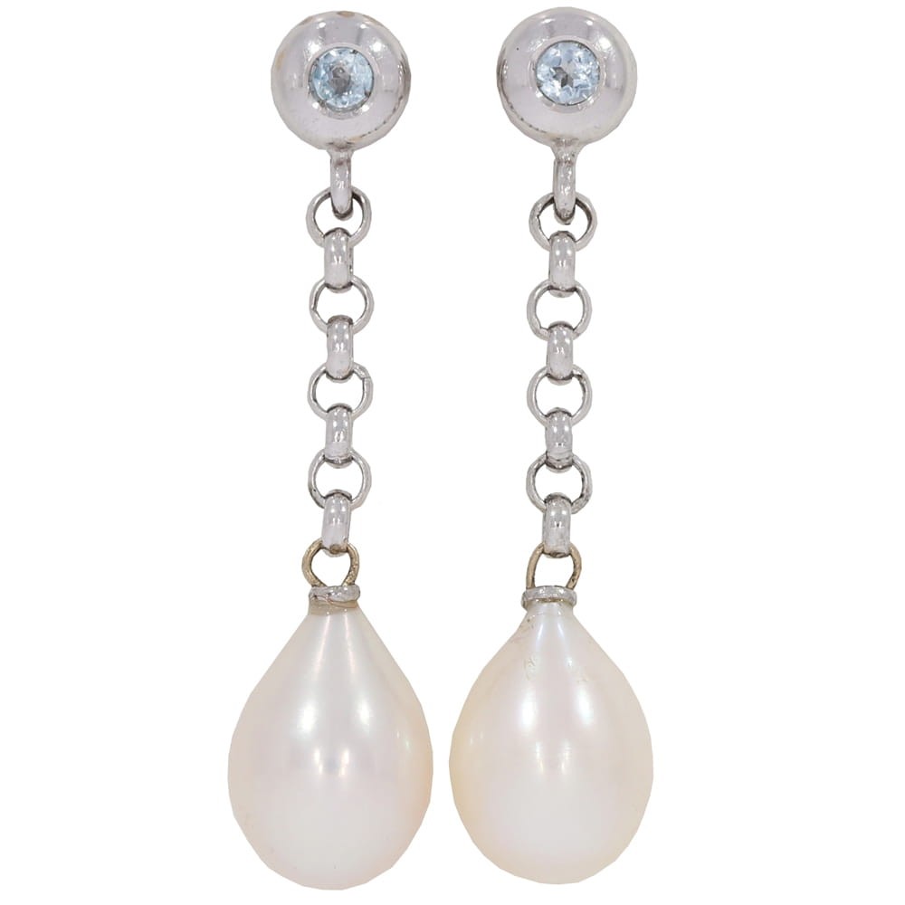 Kolczyki z akwamarynem i perłą na łańcuszku, wykonane z białego złota w próbie 750. Są nowoczesne, eleganckie, idealne jako uzupełnienie codziennej stylizacji a także dodadzą blasku w wyjątkowych chwilach.