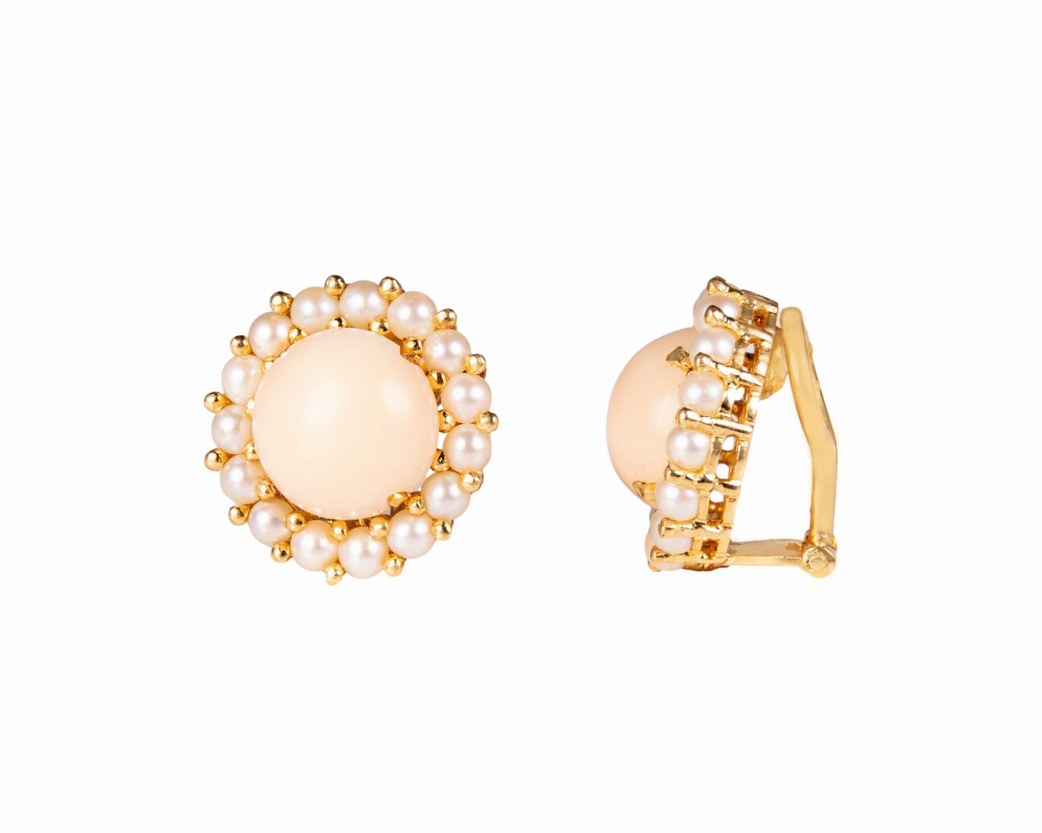 Koczyki z centralnie zakutymi różowymi koralami i karmazycją z perełek. Całość wykonana w żółtym złocie próby 750.