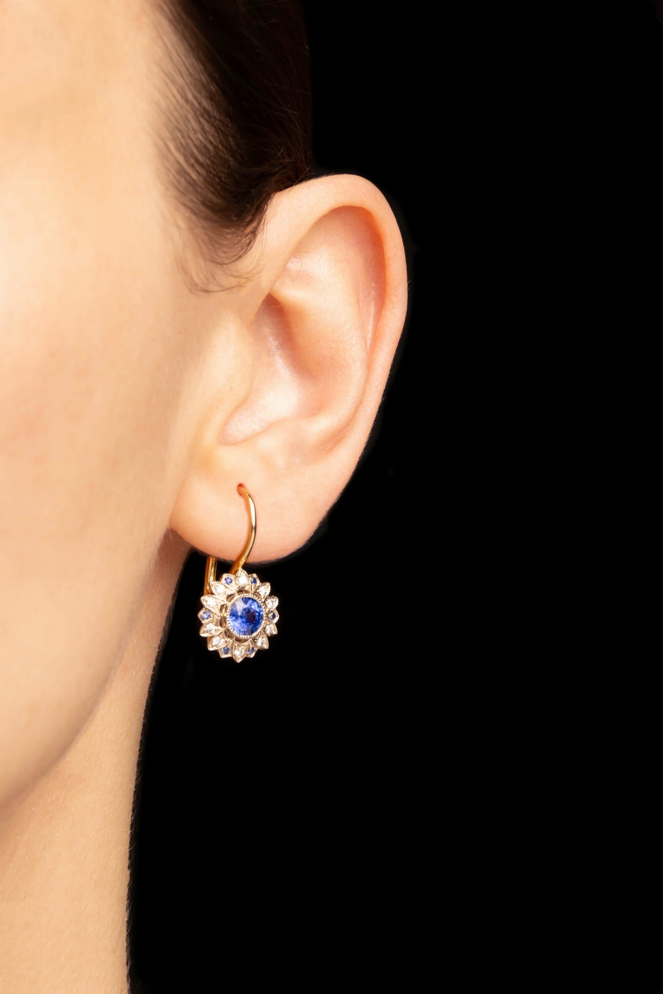 Przepiękna para kolczyków z motywem kwiatów uformowanych z ułożenia szafirów i brylantów. Kolczyki wykonano z żółtego złota próby 3, tj. 585. Przybliżona masa szafirów to 1,20 karata, a brylantów ok. 0,20 karata. Dzięki swojej uniwersalnej długości kolczyki idealnie sprawdzą się zarówno przy codziennych, co i wieczorowych kreacjach.