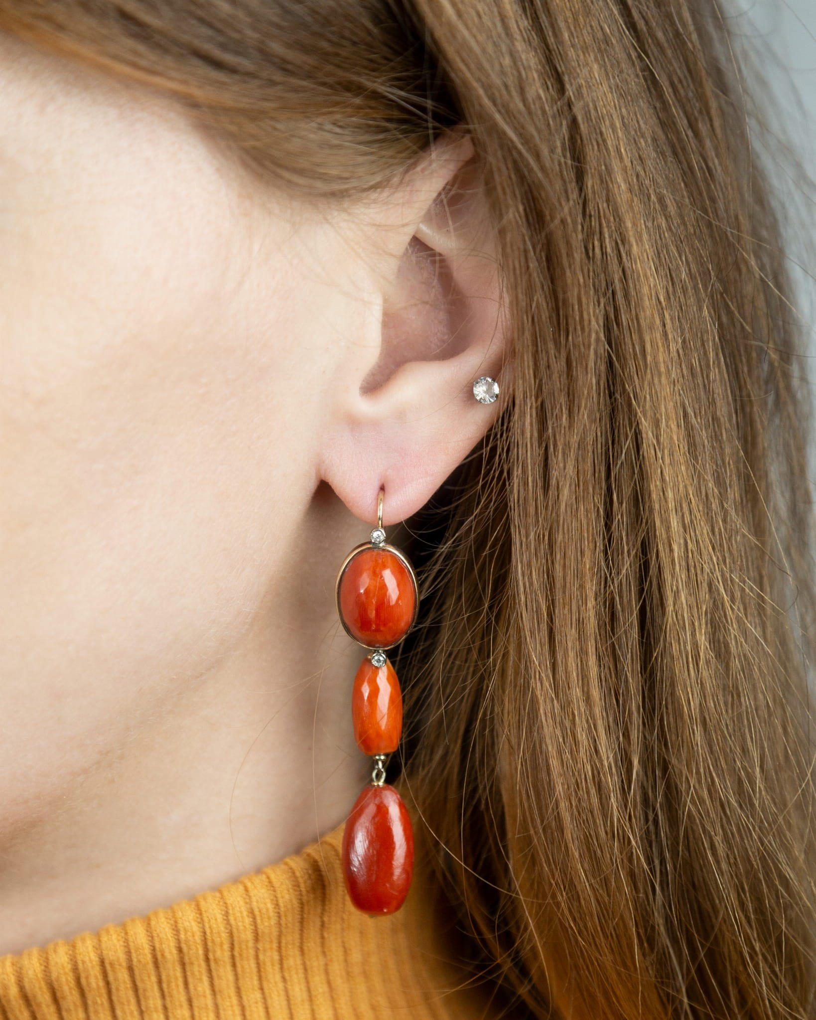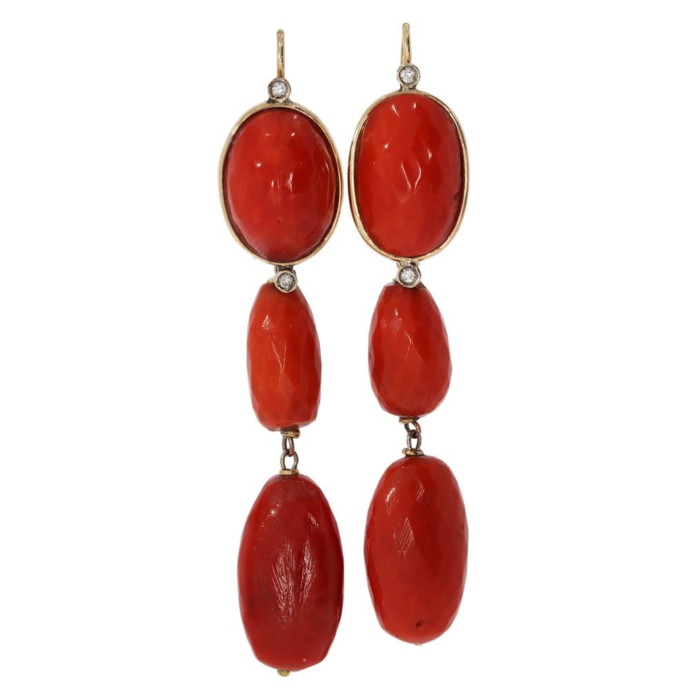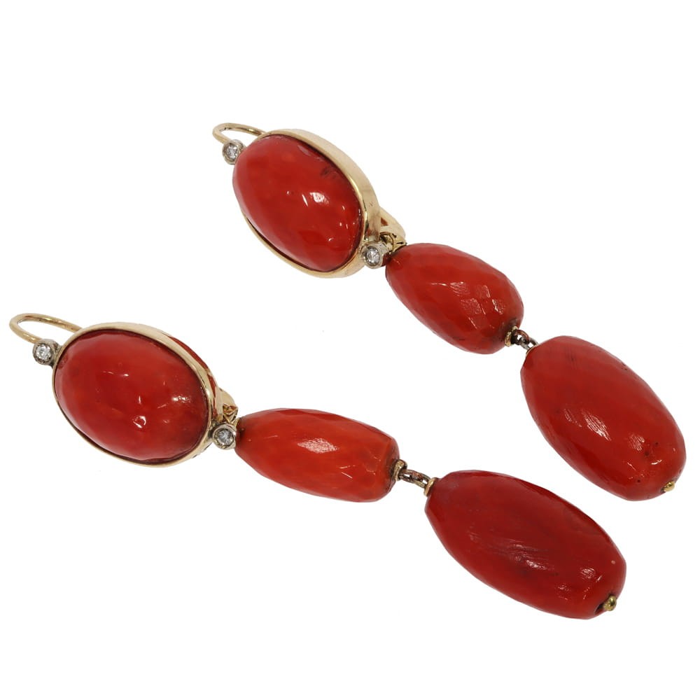 Kolczyki wiszące wykonane ze złota i srebra, ozdobione diamentami, oraz koralami fasetowanymi. Piękny produkt jednocześnie klasyczny i nowoczesny pasuje do wielu stylizacji.