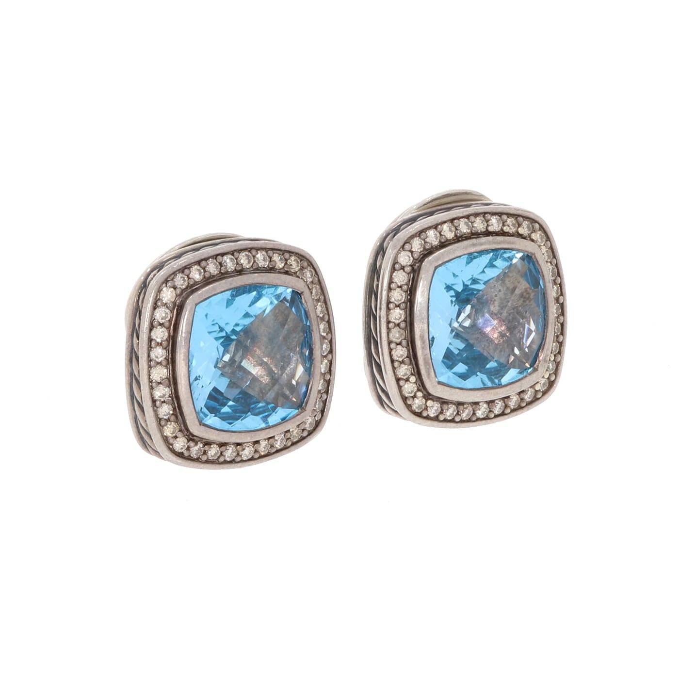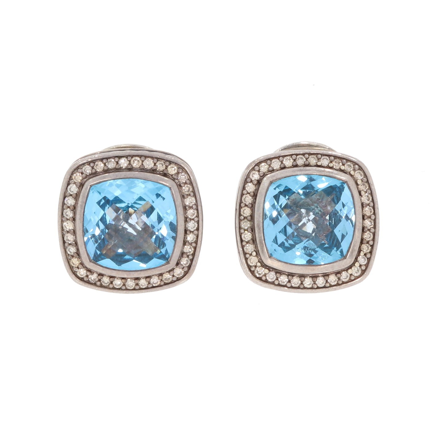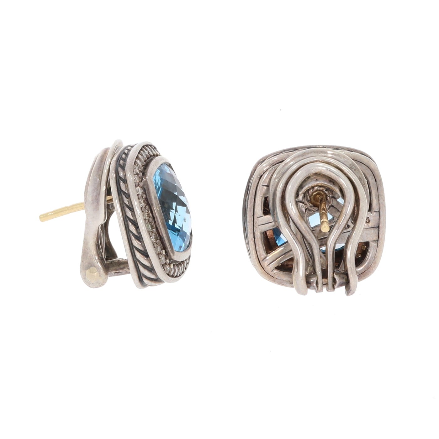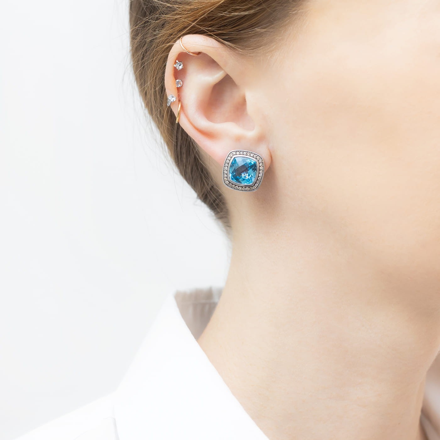 Eleganckie kolczyki z diamentami oraz błękitnymi topazami wykonane ze srebra. Mają wygodne zapięcie na sztyft. Kolczyki subtelne i stylowe. Będą doskonałym uzupełnieniem każdej stylizacji.