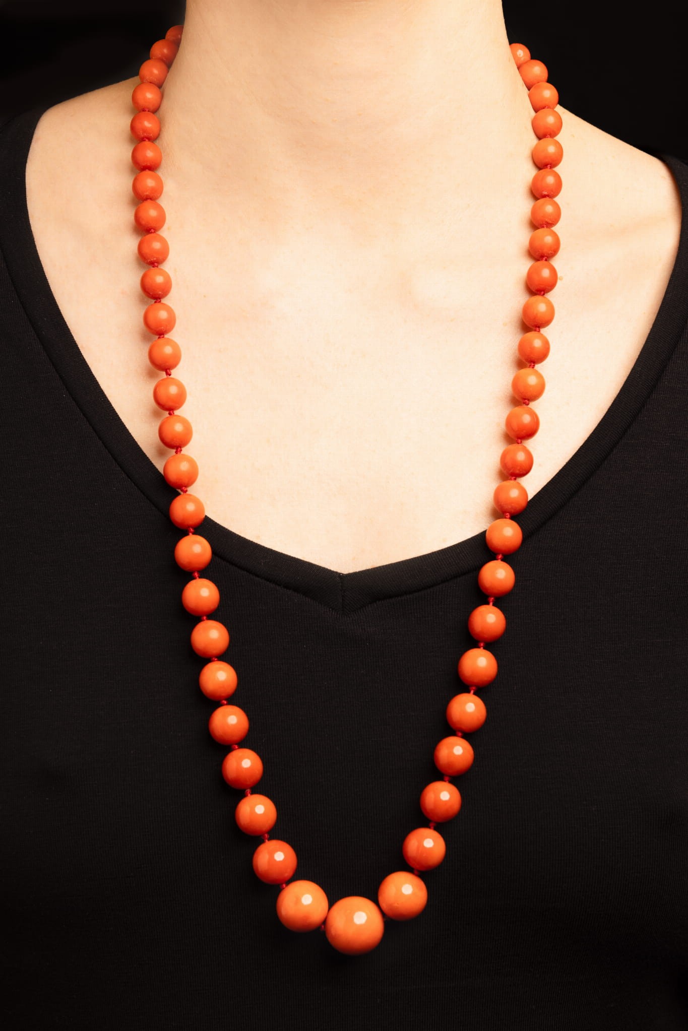 Sznur klasycznych, jednorzędowych korali, ze stopniowaną wielkością i złotym zapięciem. Naszyjnik ma długość ok 80 cm.