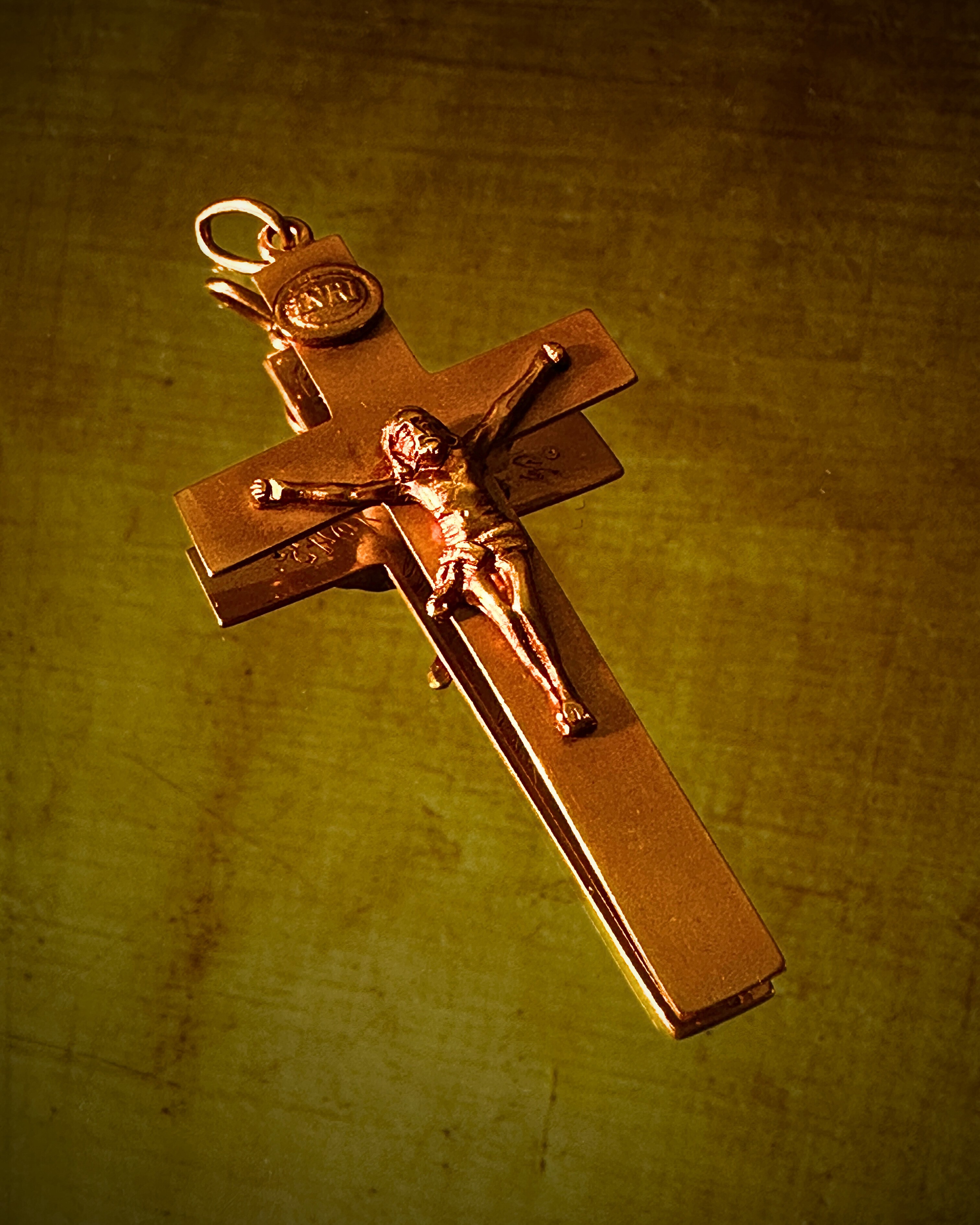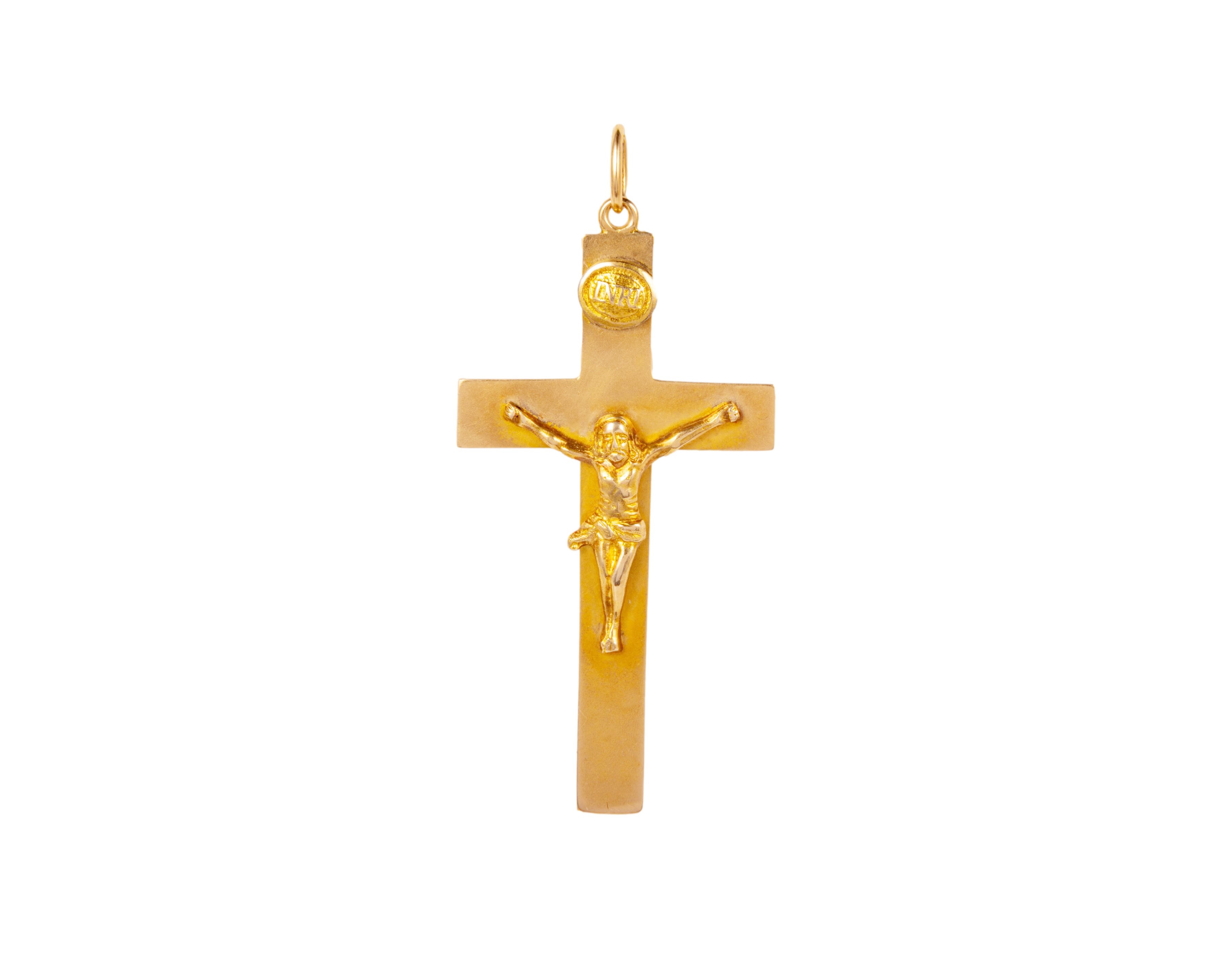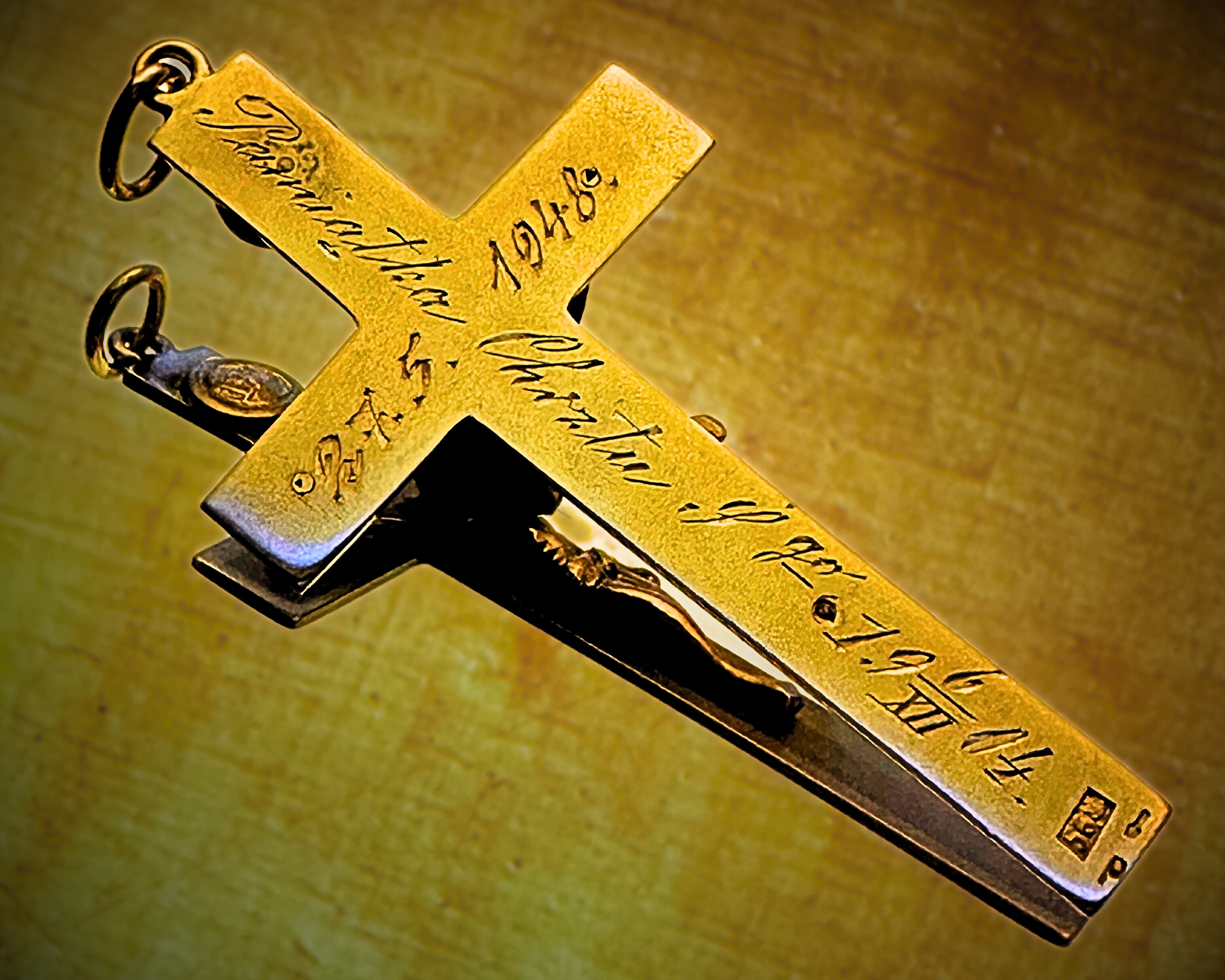 Krzyż wykonany z żółtego złota próby 56, o wymiarach 5,2 na 2,8 cm. Krzyż z tyłu ma pamiątkowy grawerunek: "Pamiątka Chrztu Świętego 6.12.1904" oraz "27.05.1948".