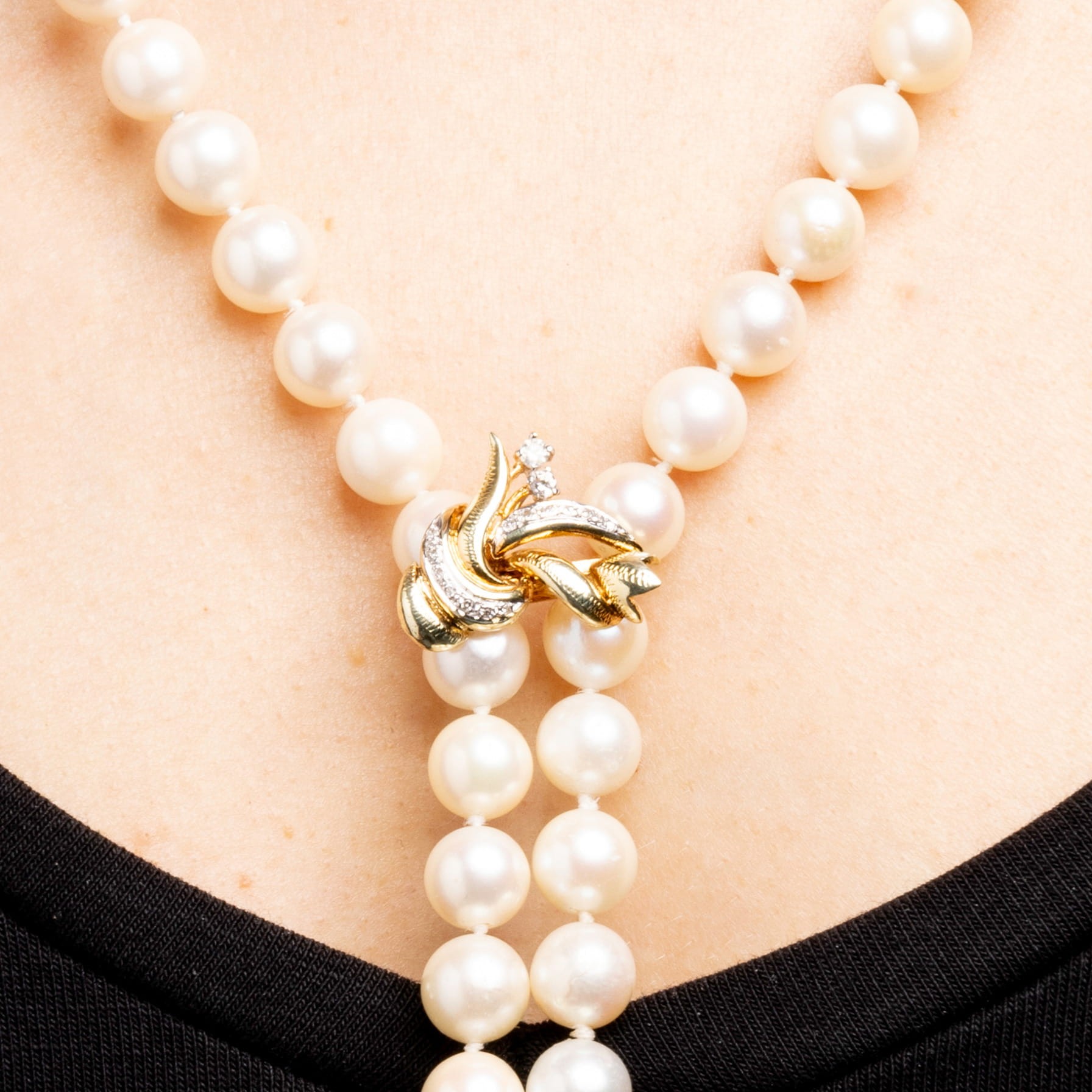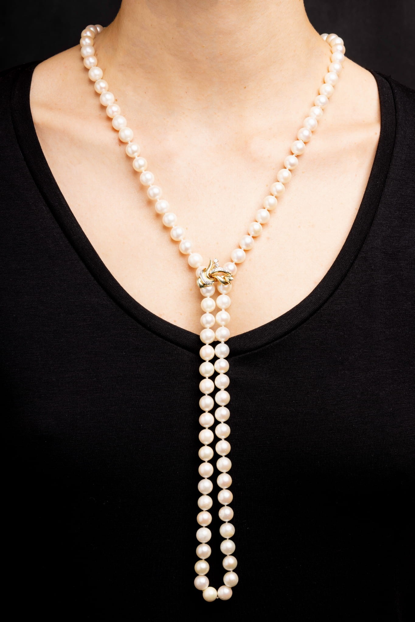 Naszyjnik z pięknych pereł ze złotym zapięciem i złotą zawieszką wysadzaną diamentami. Całość ma długość ok. 92 cm - idealnie sprawdzi się na wieczorowych kreacjach. W naszyjniku mamy 100 sztuk pereł, a łączna masa diamentów to ok. 0,25 karata. Metalowe elementy wykonano z żółtego złota różnych prób złota w przedziale Au 585-400. Zawieszka zrobiona z motywem florystycznym.