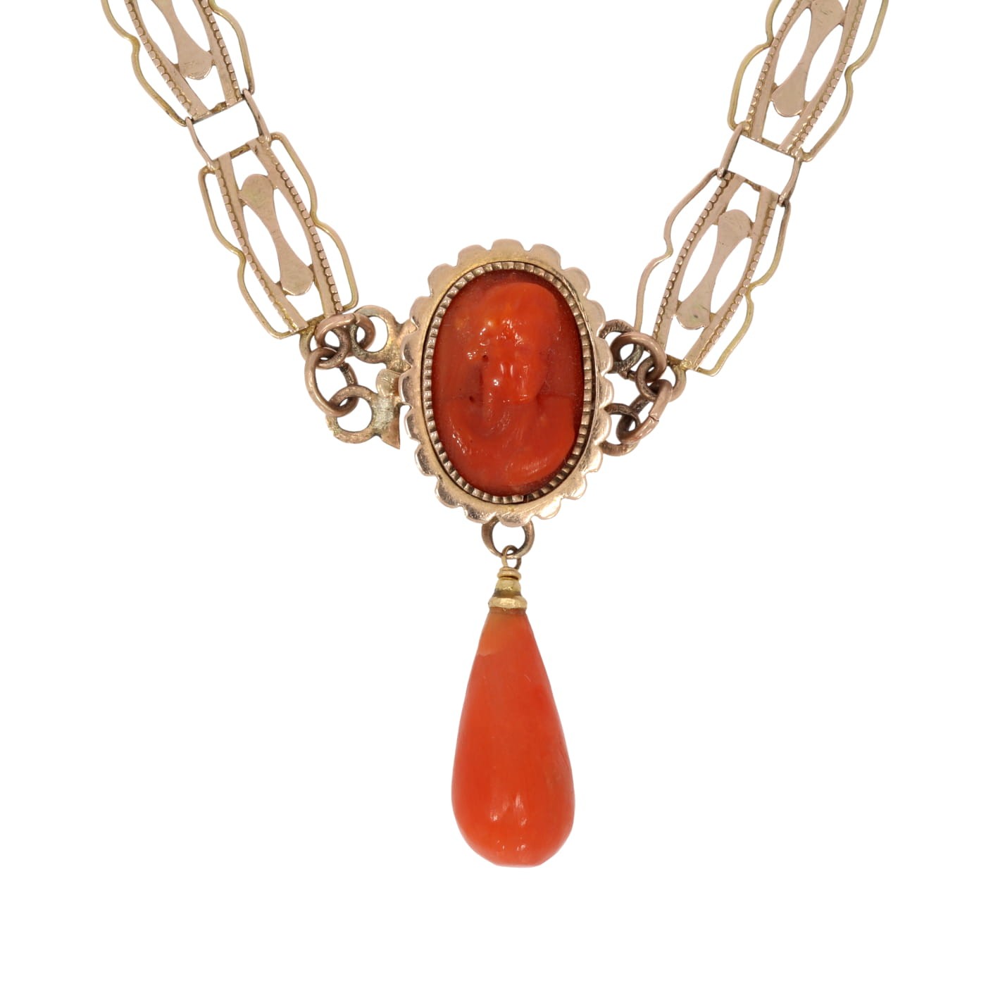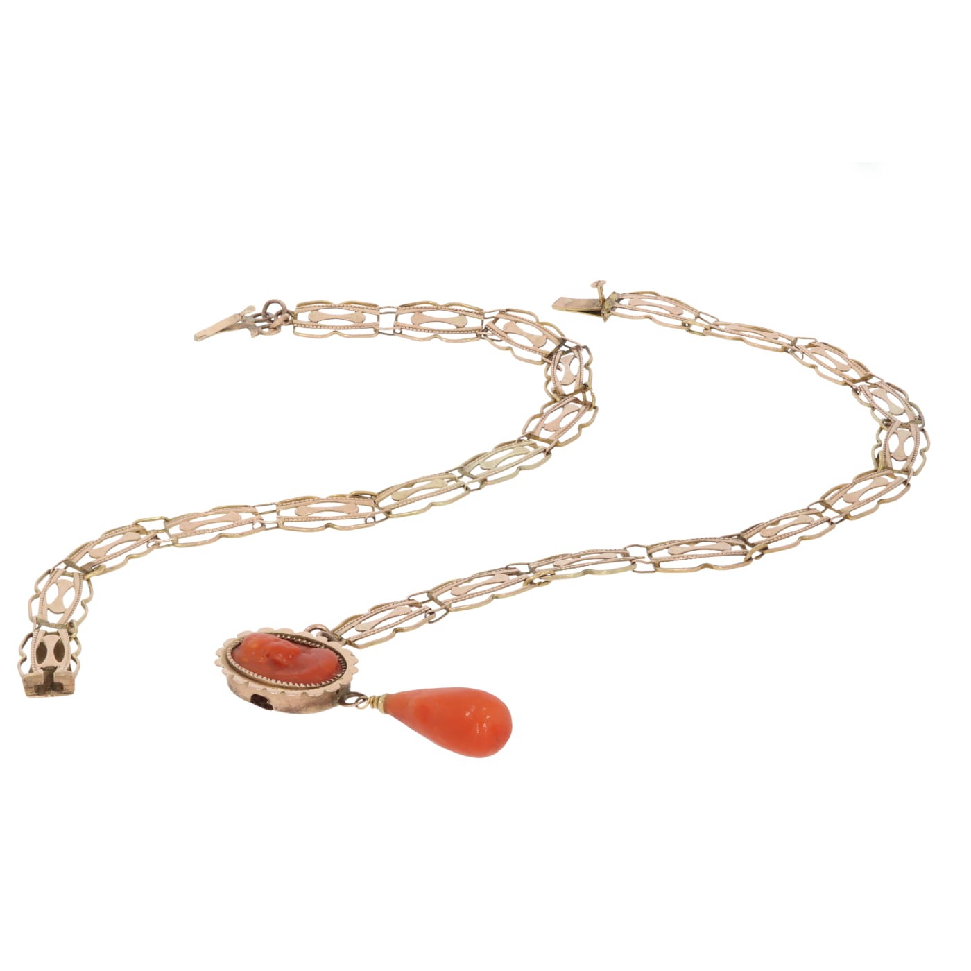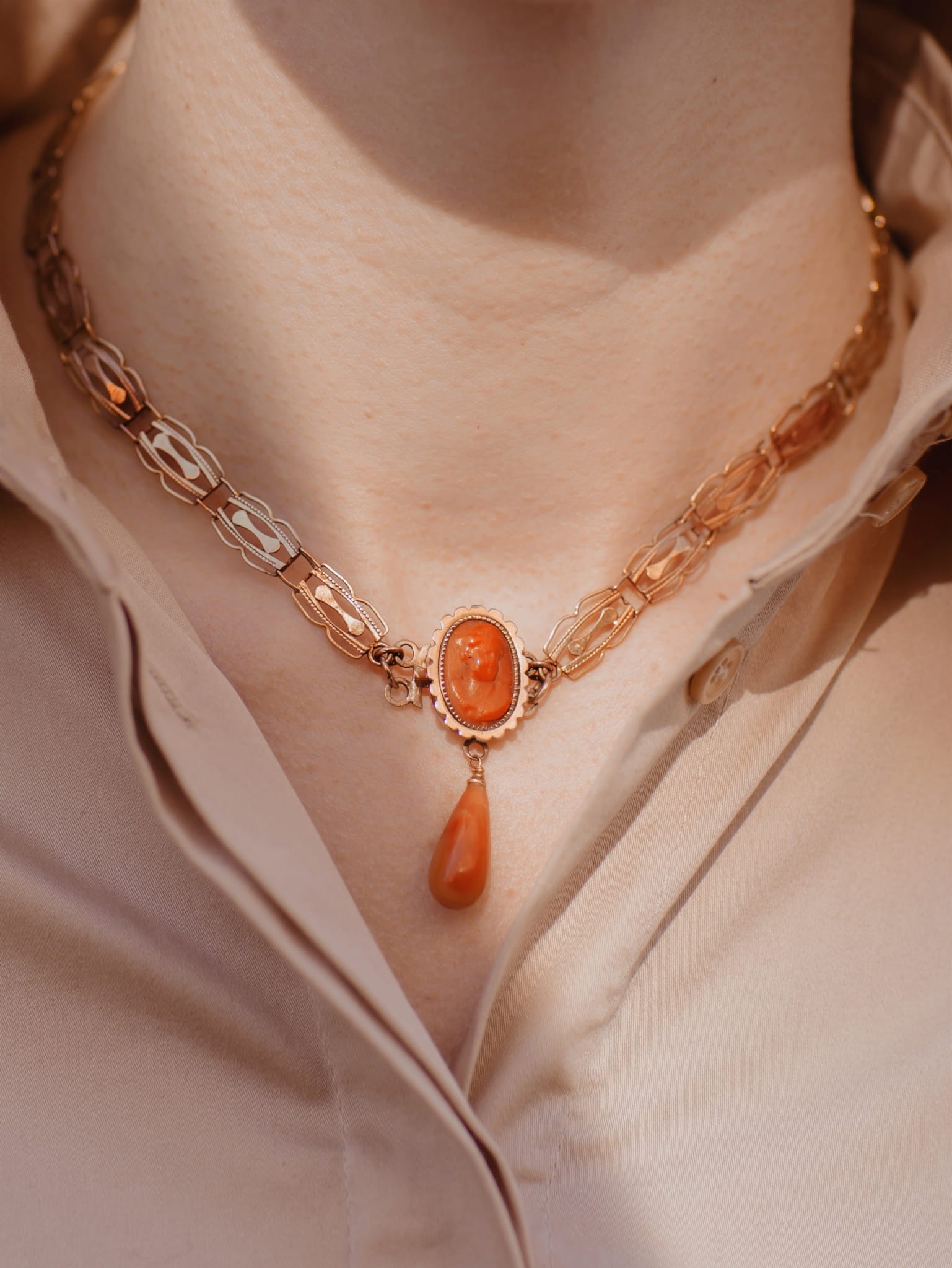 Naszyjnik dwuczęściowy z żółtego złota z rzeźbionym koralem