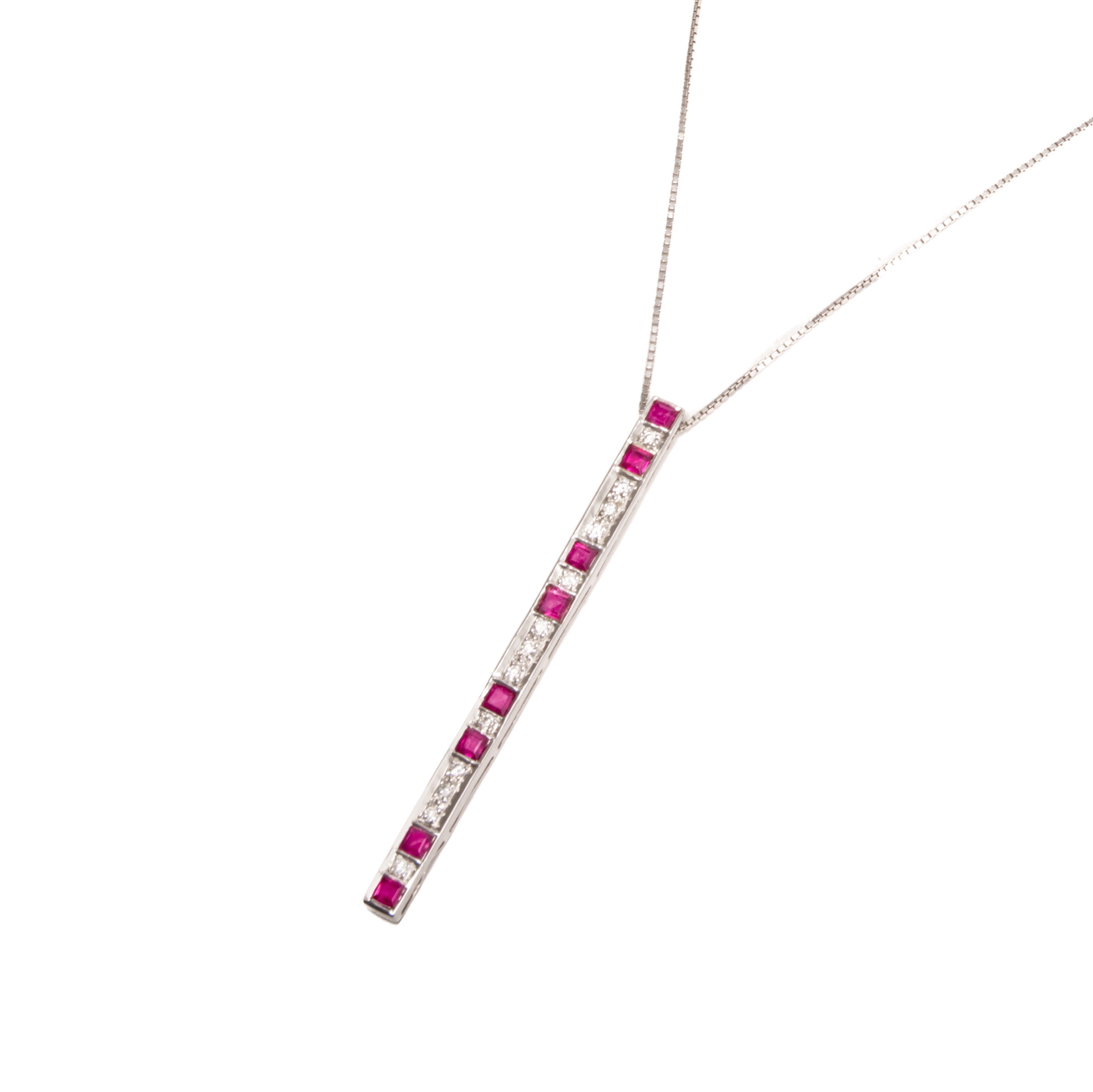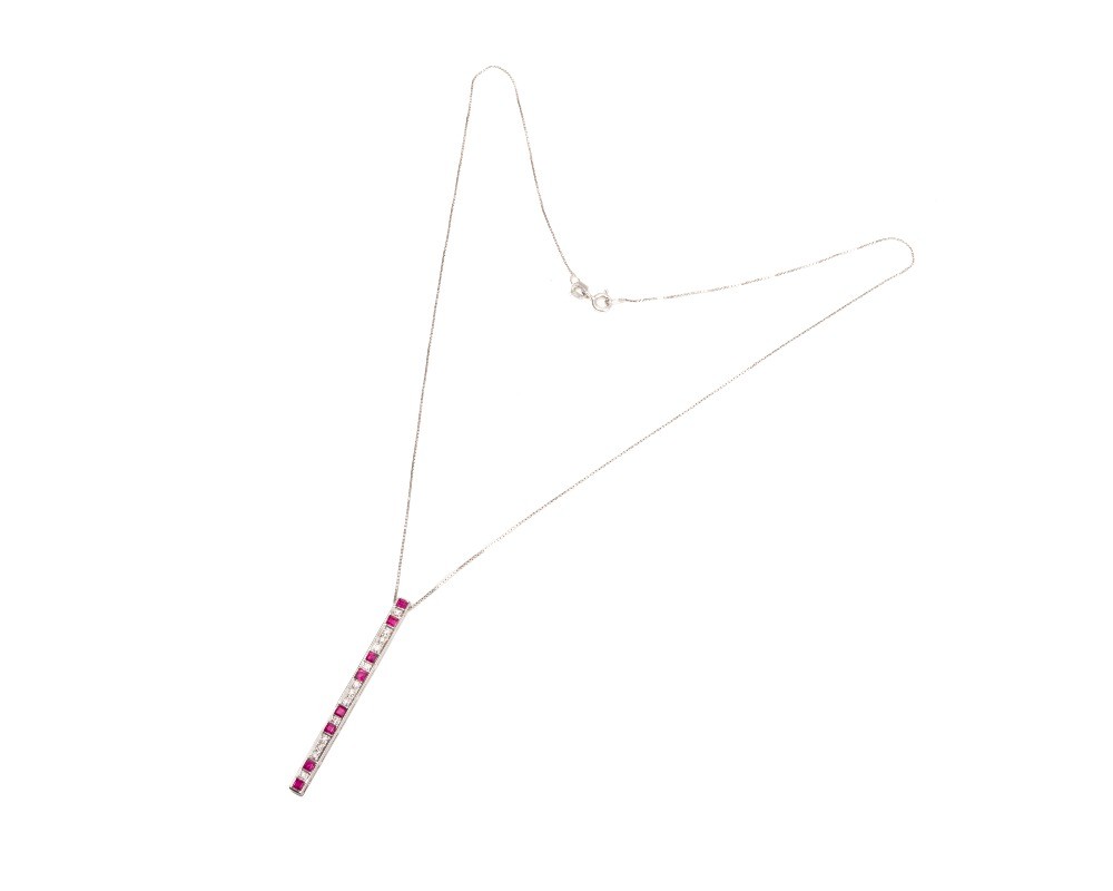 Ciekawy naszyjnik wykonany z białego złota próby 750 z podłużną zawieszką, w której zakuto 8 rubinów i 13 diamentów. Długość naszyjnika to ok. 45 cm, łańcuszek jest w splocie typu kostka.