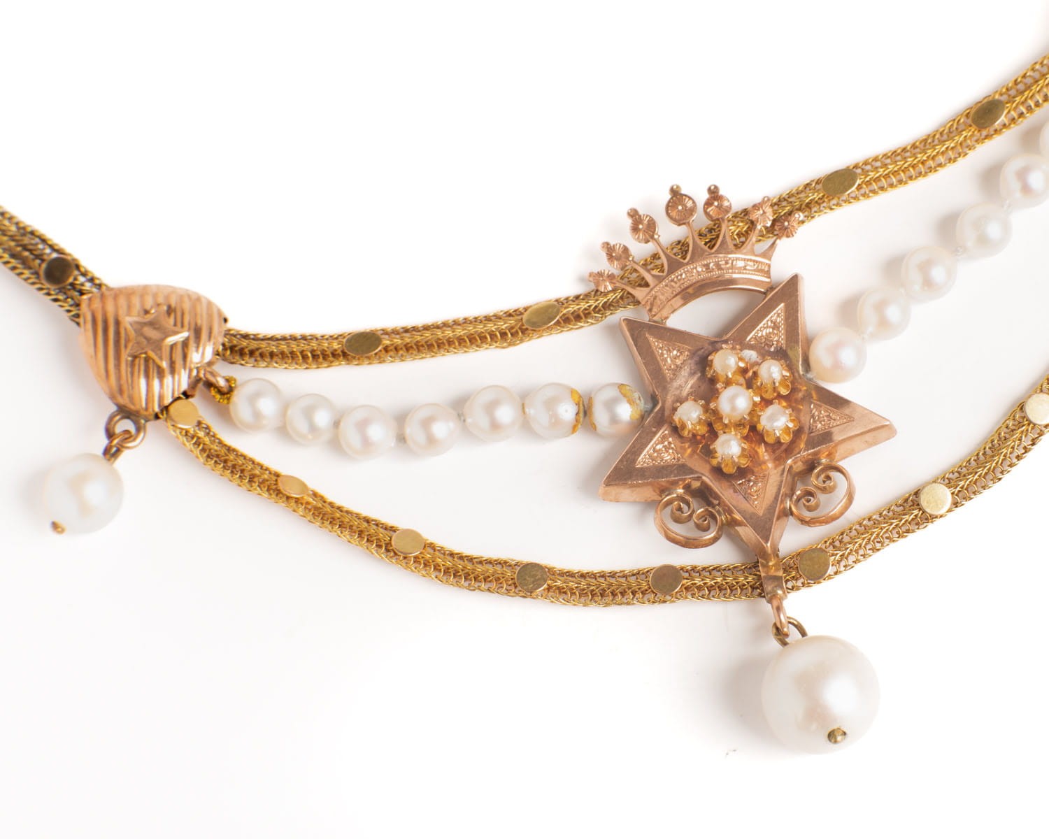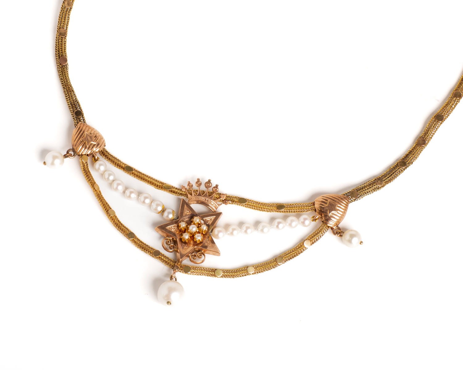 Wyjątkowy naszyjnik w oryginalnej formie. Jedyny w swoim rodzaju, więc idealny dla osób poszukujących nietypowych, ale dobrze wykonanych ozdób. Naszyjnik wykonany ze złota i starego rodzaju pereł. Sztywno utrzymuje się na dekolcie, więc nie zmienia swojego położenia.