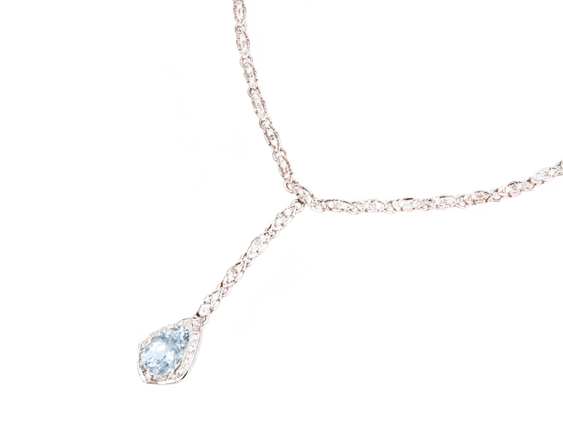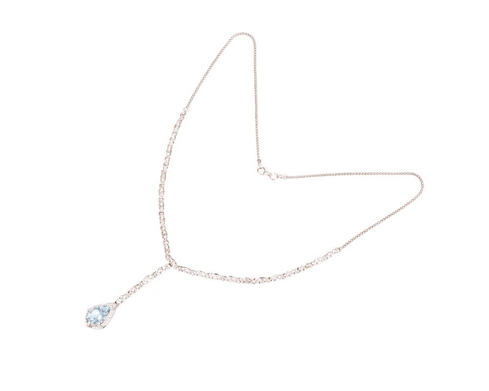 Elegancki naszyjnik wykonany z białego złota wysokiej próby 2, tj. 750. Naszyjnik jest wysadzany 68 brylantami o łącznej masie ok. 0,80 karata, a głównym kamieniem jest tu akwamaryn w szlifie fasetowanym, o kształcie gruszki/łezki, przybliżonej masy 2,90 karata. Czystość brylantów mieści się w przedziale VS-Si, a ich barwa H-I. Długość naszyjnika to ok. 48 cm, a zawieszki ok. 5 cm.
