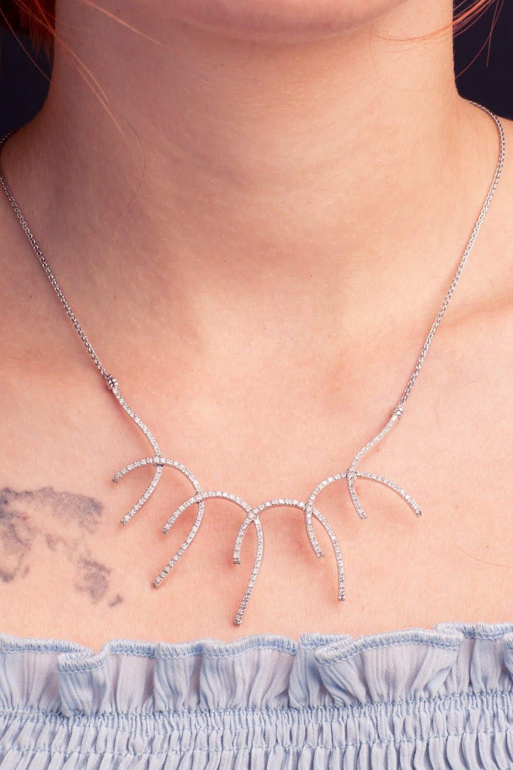 Fascynujący naszyjnik wykonany z niezwykłą precyzją. Części pokryte diamentami poruszają się, dzięki czemu pięknie układają się na dekolcie.
