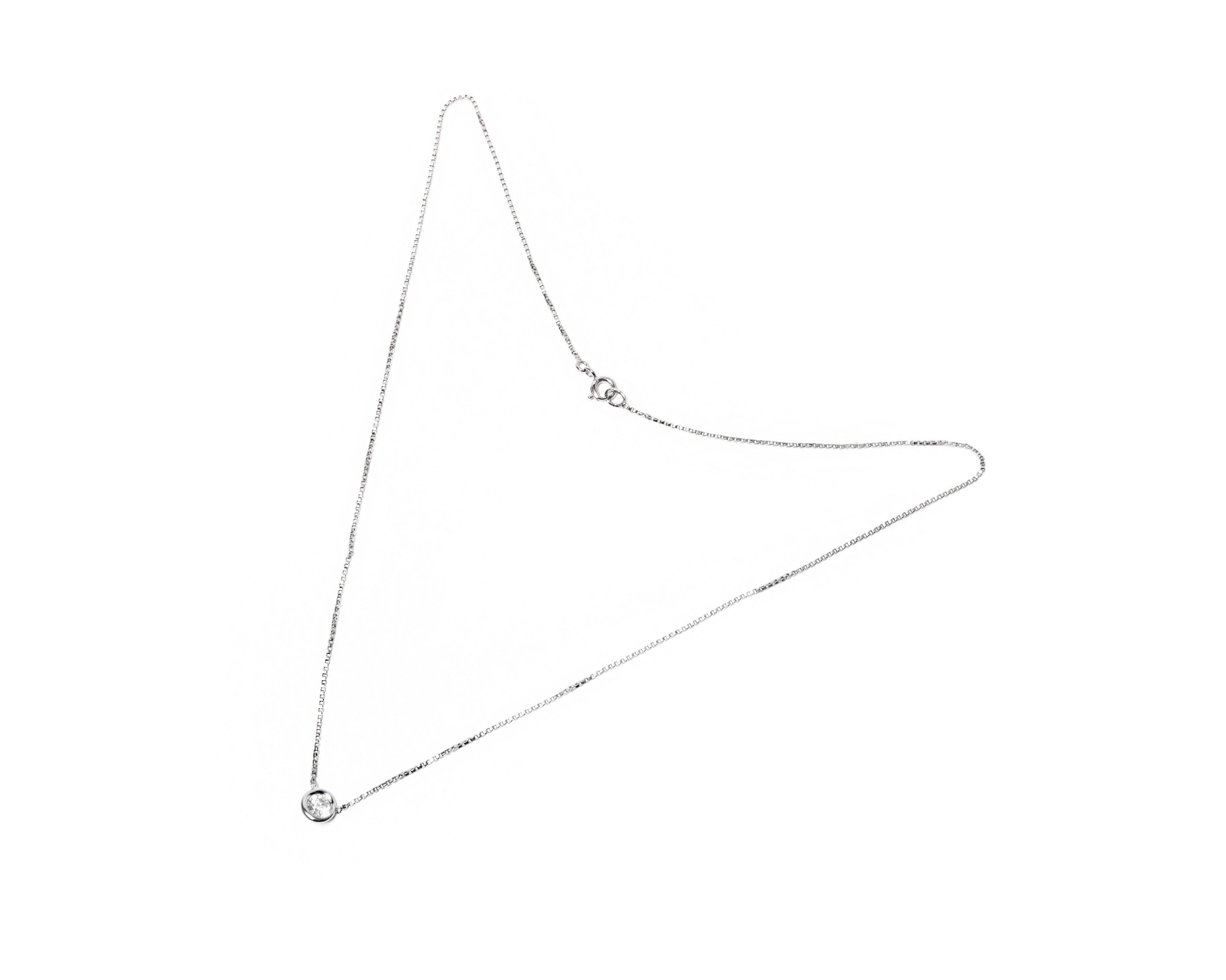 Naszyjnik typu magic diamond, na który składa się łańcuszek w splocie kostka i zawieszka z diamentem o średnicy ok. 4,80 mm zakutym w pełną oprawę typu carga. Diament ma masę ok. 0,40 karata, czystość VS1 oraz barwę G. Naszyjnik wykonano z białego złota próby 585, na długość ok. 46 cm.