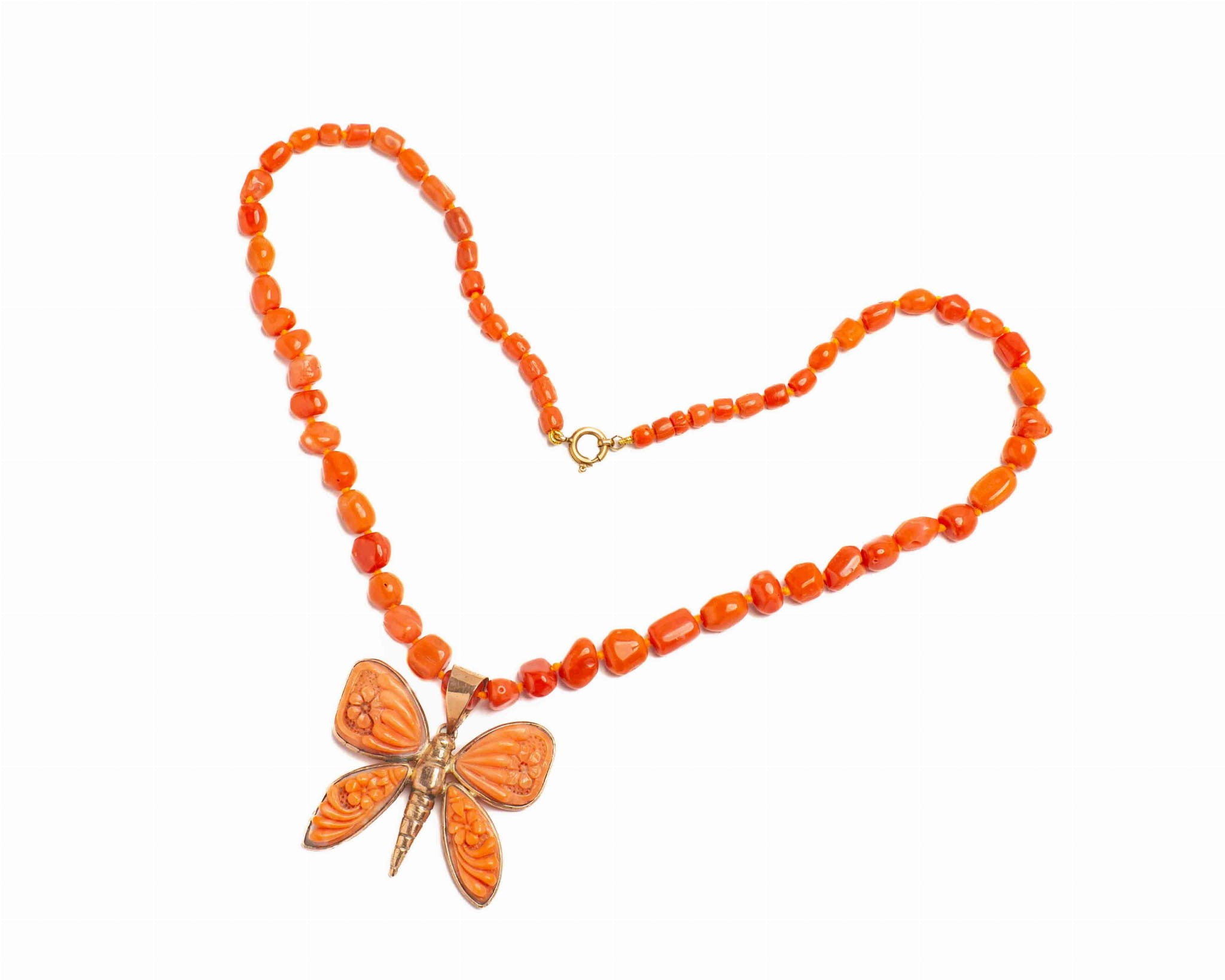 Naszyjnik z koralami z pięknym rzeźbionym motylem, także wykonanym z korala.