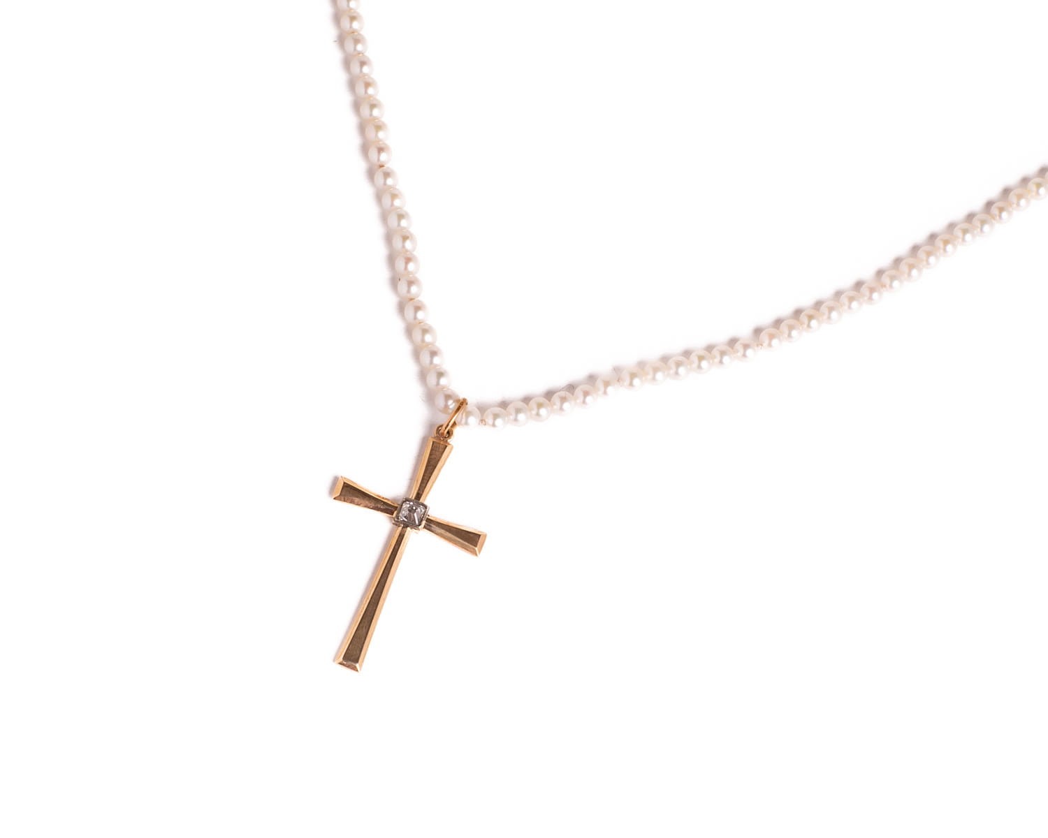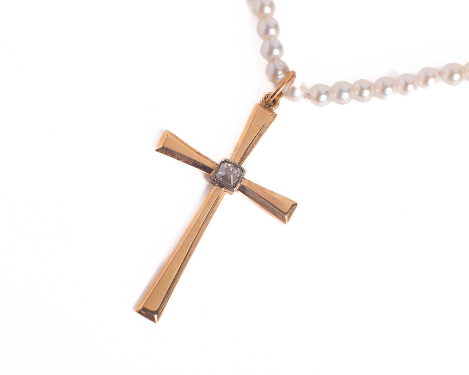 Złoty krzyżyk z diamentem na sznurze pereł słodkowodnych. Diament w szlifie cushion, perły okrągłe.