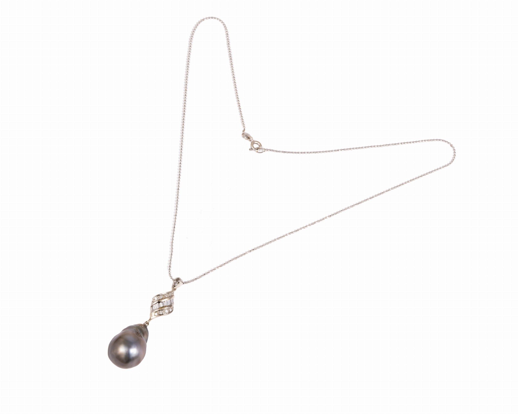 Złoty naszyjnik, na który składa się delikatny łańcuszek oraz zawieszka z diamentami i ciemną perła Tahiti o nieregularnym kształcie. Całość wykonana w białym złocie w większości próbie od 720 do 750 oraz mniejszymi elementami od 560 do 585 - według świadectwa badania z urzędu probierczego. Długość naszyjnika to ok. 50 cm.