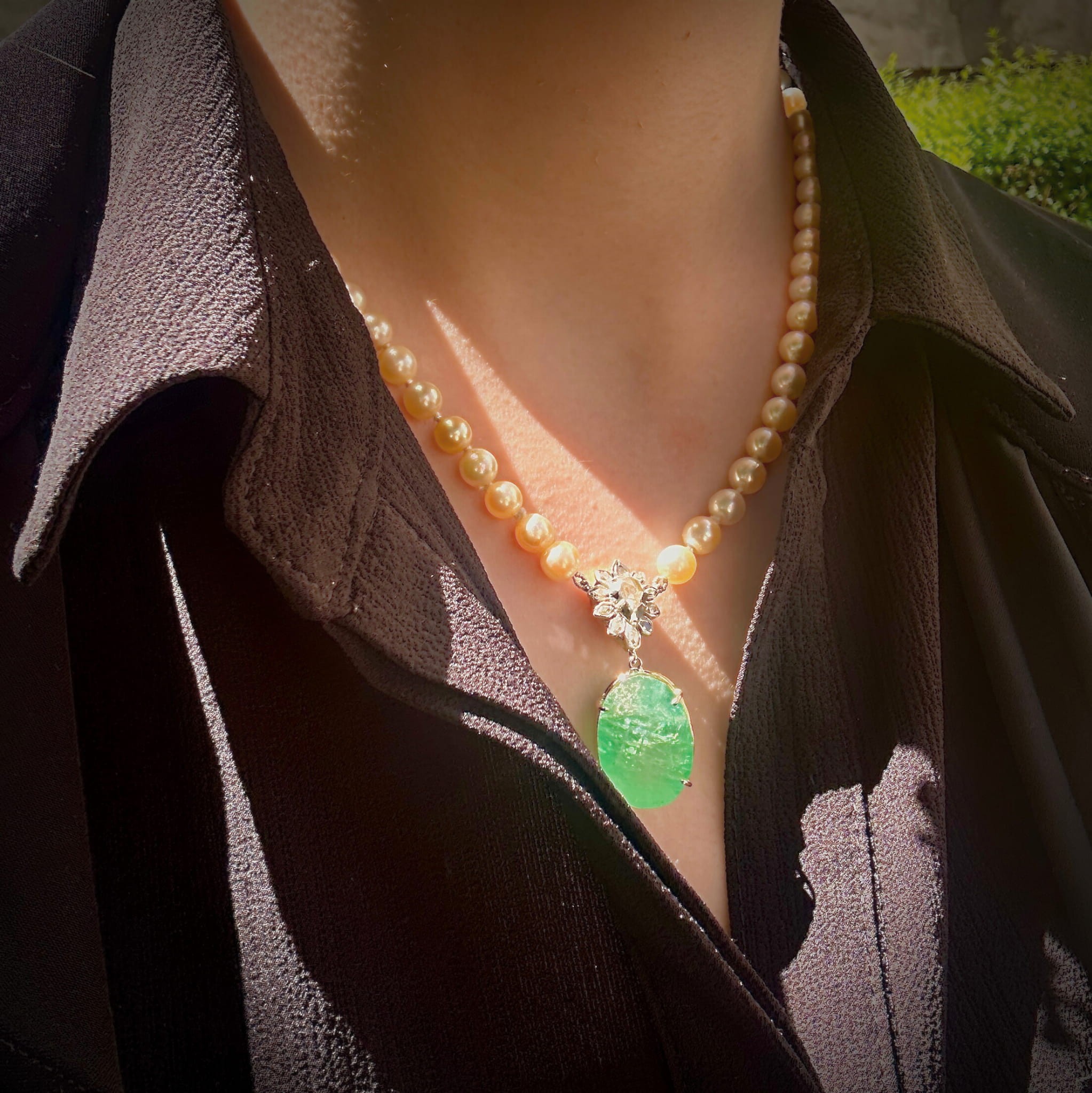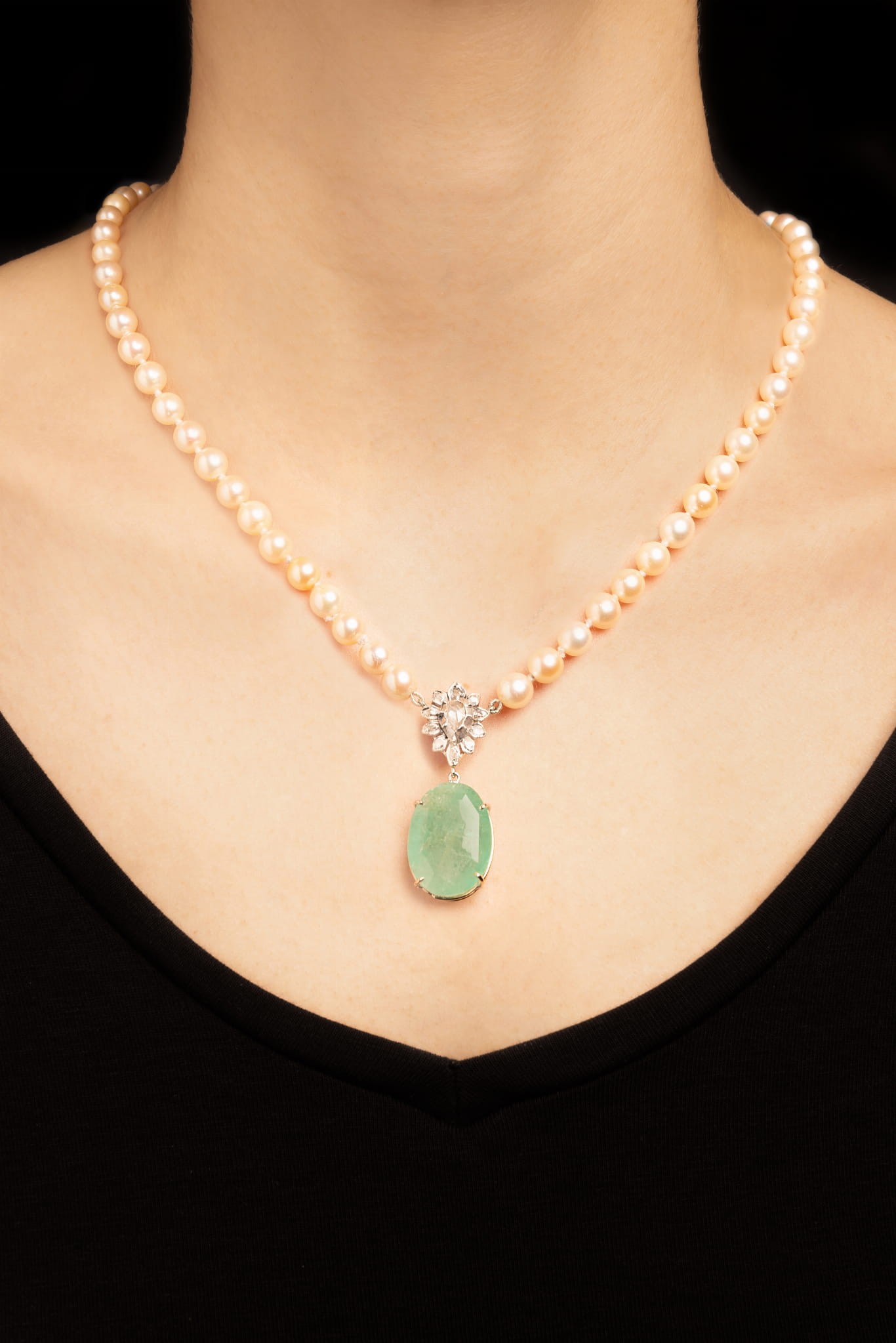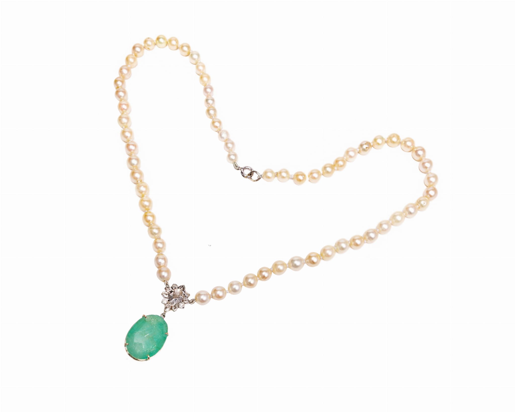 Naszyjnik z pereł Akoya z piękną zawieszką, na którą składa się szmaragd o masie ok. 17,5 karatów oraz górna część z motywem kwiatowym z zakutymi w nim rozetami i rautami diamentowymi.