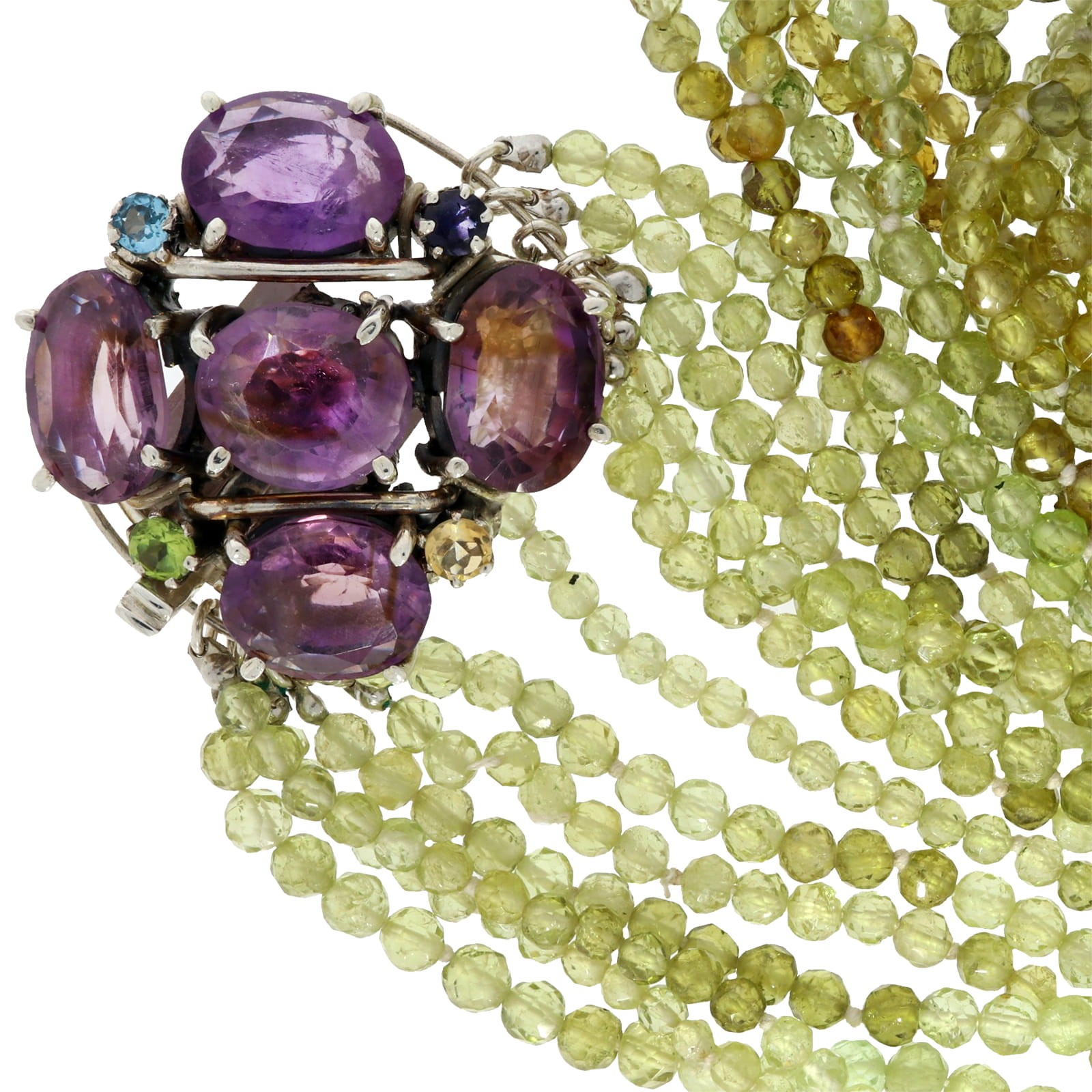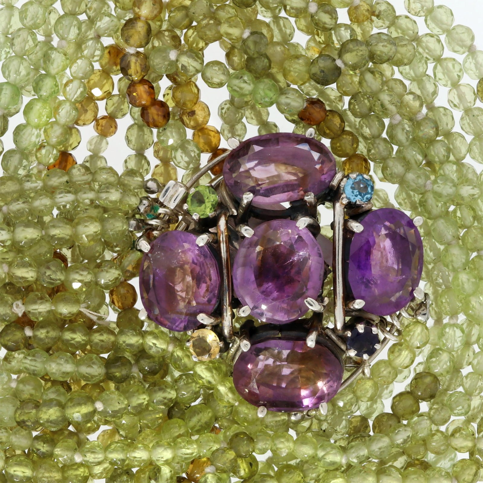 Duży naszyjnik z 6 rzędów turmalinów/oliwinów na ozdobne zapięcie z 4 dużych ametystów. Piękny i imponujący, w sam raz dla osoby kochającej dużą, widoczna biżuterię.