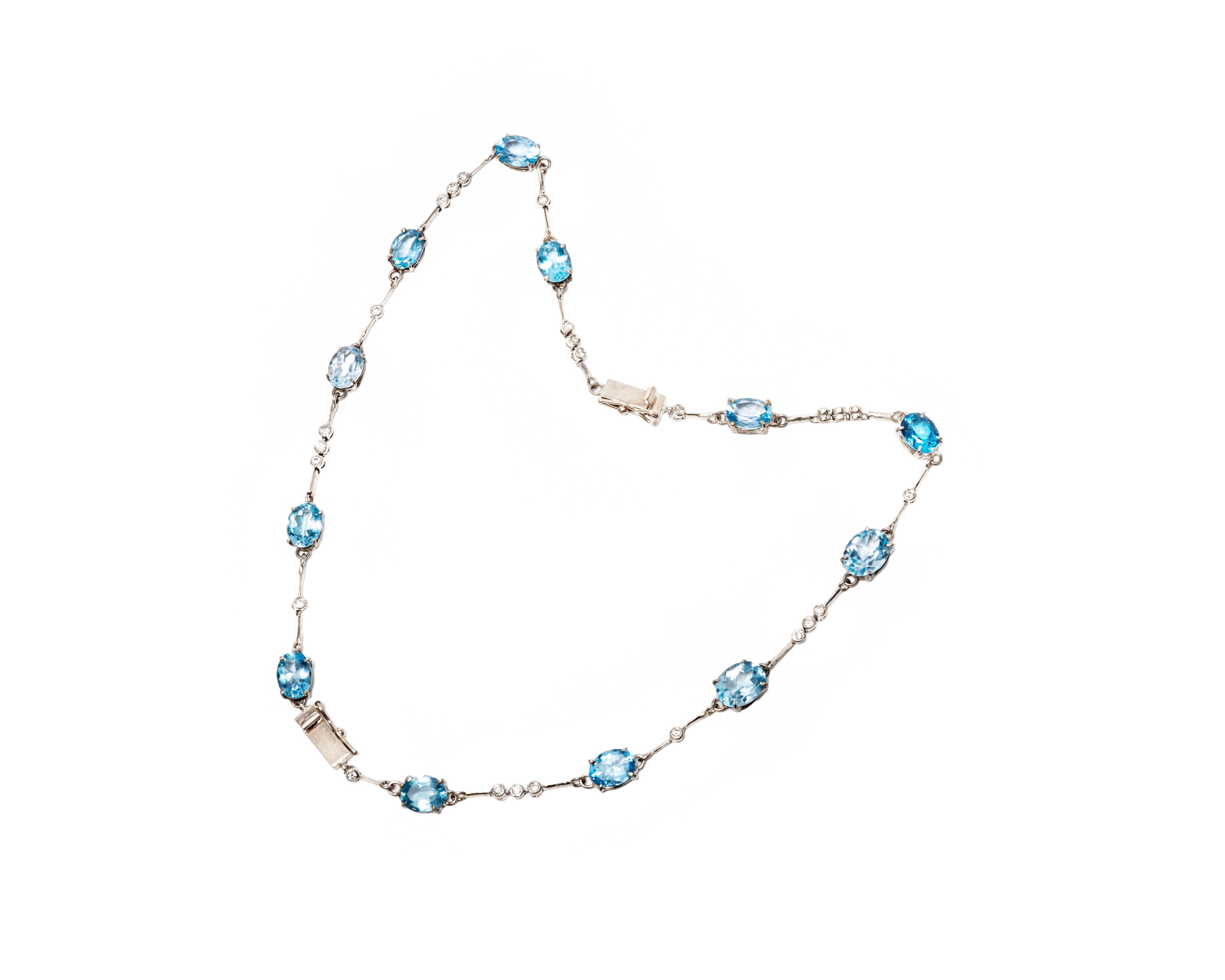 Naszyjnik zrobiony z dwóch bransoletek spinanych ze sobą - można również je nosić oddzielnie. Naszyjnik ma długość 36 cm, bransoletki mają klasyczne zapięcia szufladkowe po jednej bocznej ósemce zabezpieczającej przed przypadkowym odpięciem. Jest tu łącznie 12 topazów i 24 diamentów - pozakuwanych naprzemiennie tworząc wzór. Całość wykonana z białego złota próby 750.