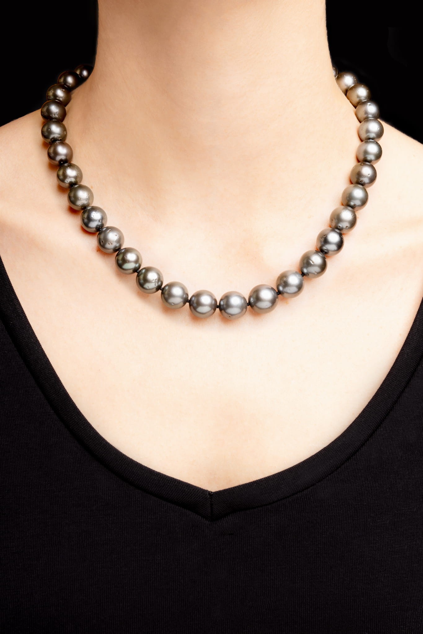 Naszyjnik zrobiony z 35 czarnych pereł Tahiti o wymiarach: 11 - 12,8 mm, całość ma długość 45 cm. Zapięcie do naszyjnika jest okrągłe, wykonane z białego złota, wysokiej próby tj. 750. Ciemne perły świetnie sprawdzą się przy wieczorowych kreacjach.