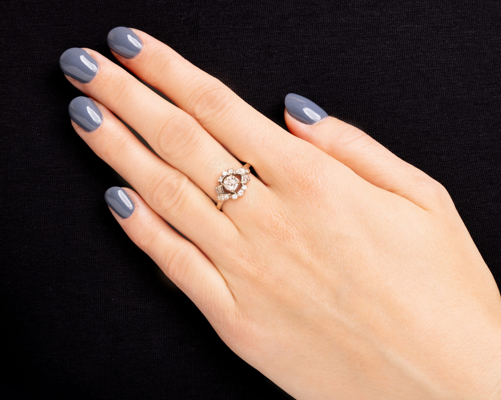 Asymetryczna aureola, mieszanka szlifów i wysoka oprawa centralnego kamienia to cechy charakterystyczne biżuterii w stylu Art Deco i glamour lat 50. Pierścionek ma charakter vintage – odróżnia się od współczesnych, geometrycznie uproszczonych projektów. Sprawdzi się jako pierścionek zaręczynowy dla kobiet ceniących nieoczywiste wzornictwo, a także jako efektowna ozdoba na wieczór do eleganckiej stylizacji. Nie wymaga dodatkowej biżuterii – sam w sobie jest kompletną wypowiedzią.