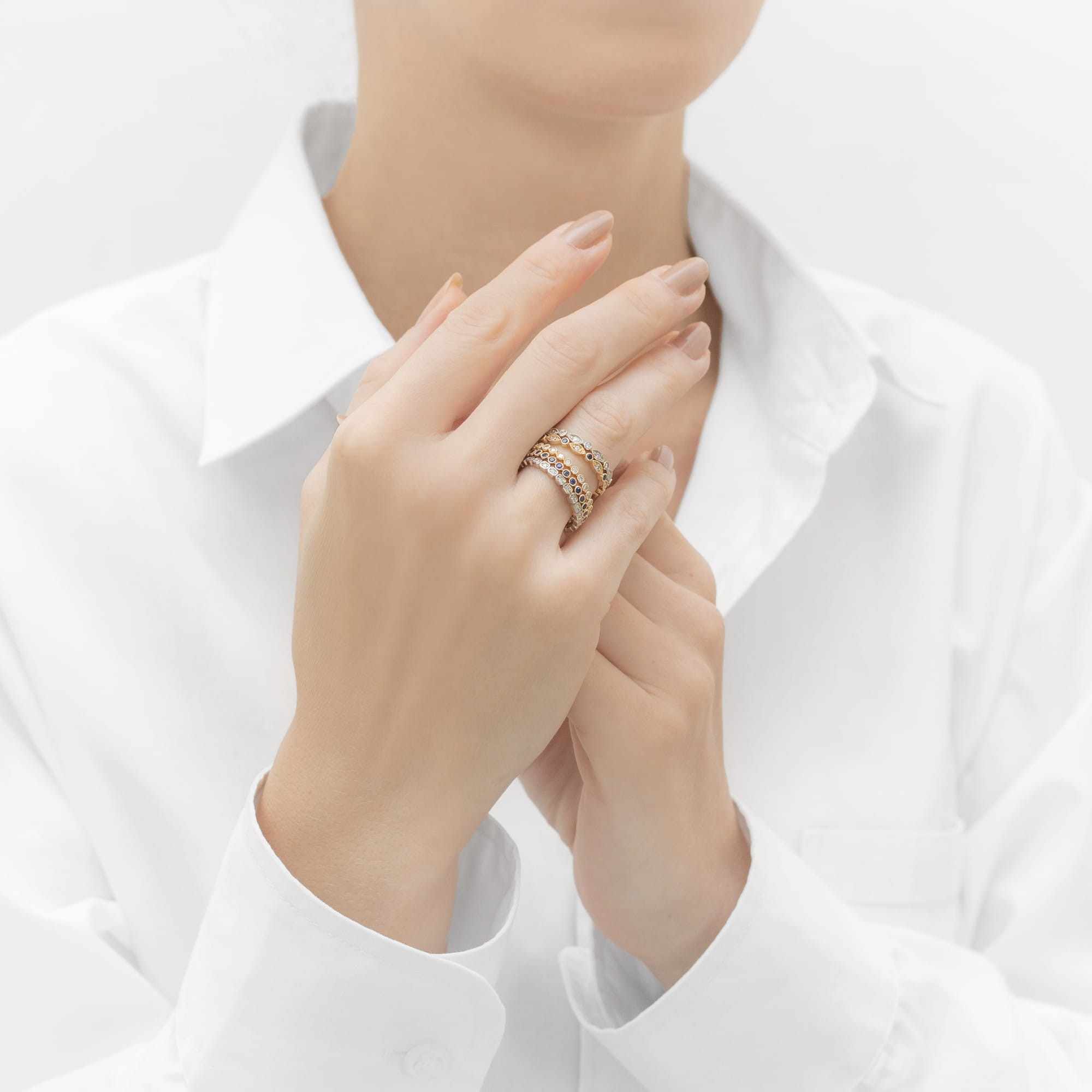 Delikatny pierścionek eternity z białego złota z brylantami.