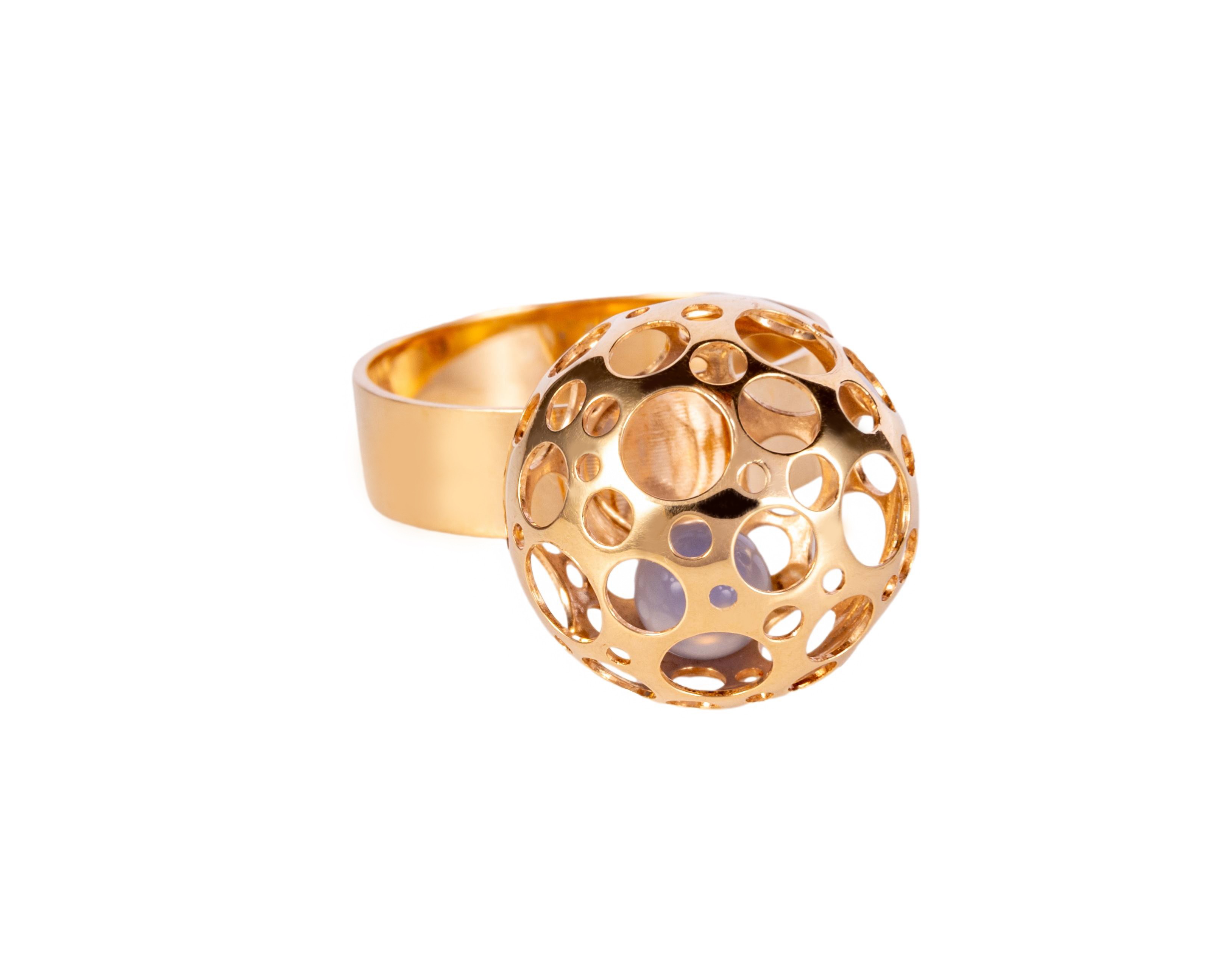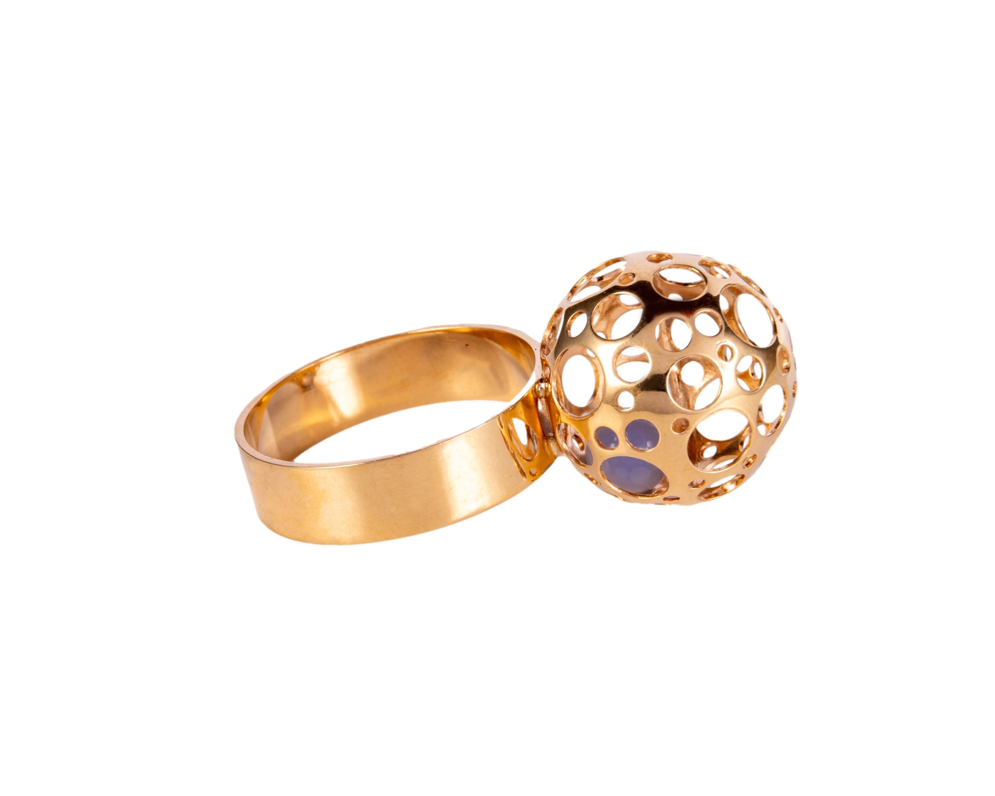 Nietypowy pierścionek, w którego sferycznej górce z nieregularnymi otworami umieszczono ruszający się element. Pierścionek wykonany z żółtego złota próby 585, na rozmiar 14.