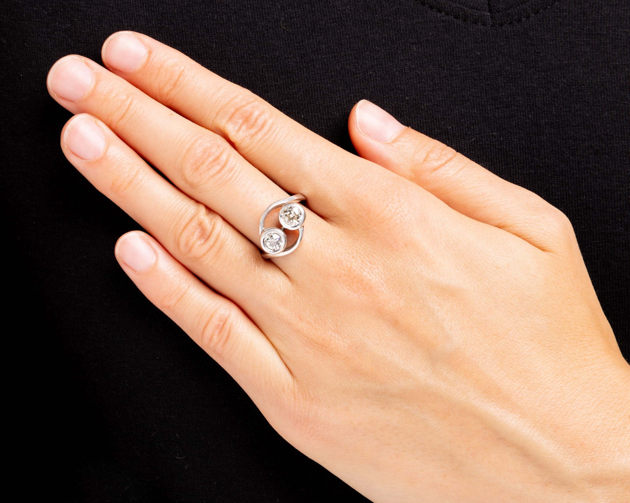Pierścionek w ciekawej oprawie o opływowym kształcie z osadzonymi dwoma diamentami (jeden masy ok. 0,54 karata, drugi ok. 0,21 karata). Całość wykonana w białym złocie (Au 0,690).