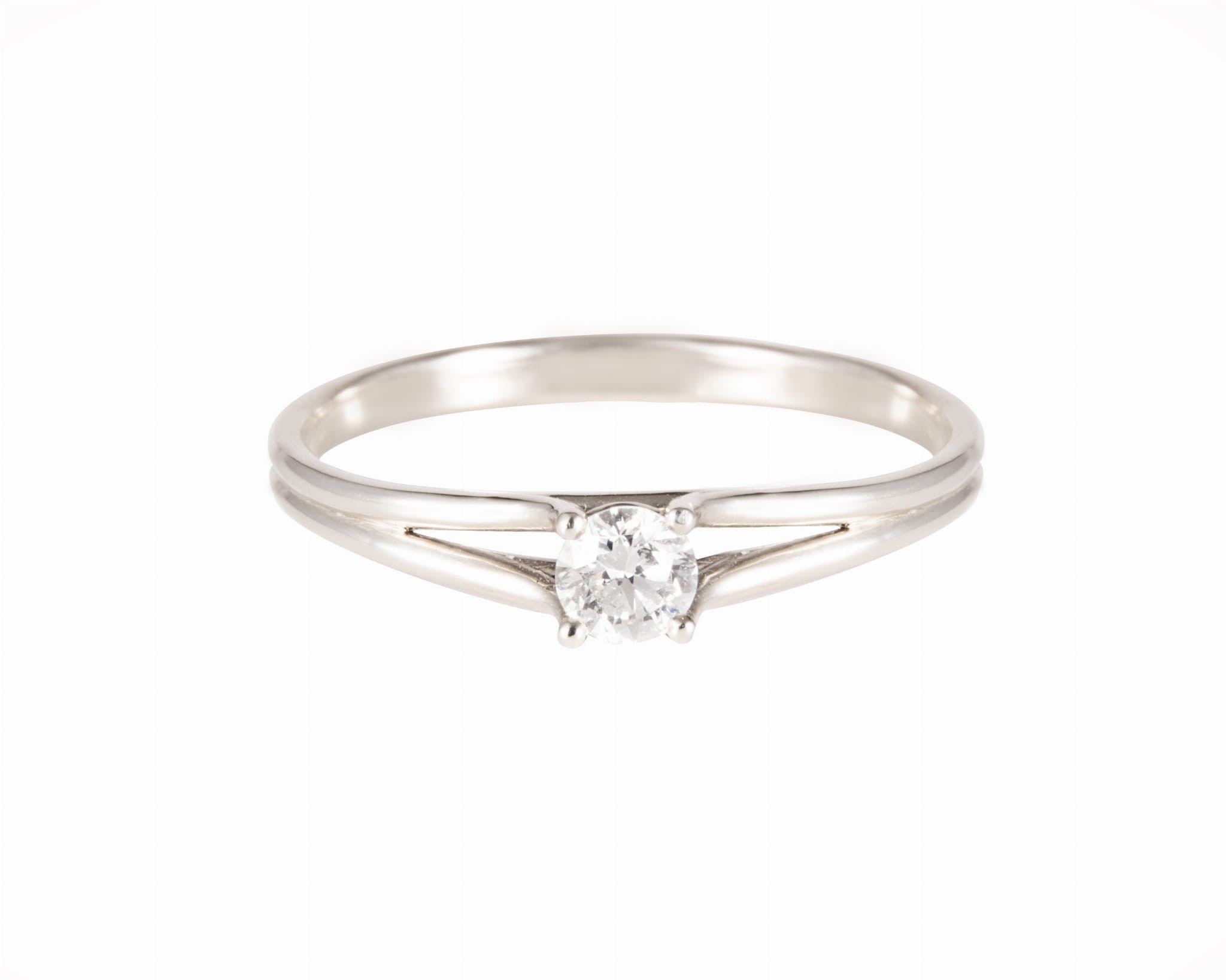 Subtelny pierścionek z centralnie osadzonym diamentem masy ok. 0,23 karata, czystości Si1 i barwy G. Całość wykonano w białym złocie próby 585, na rozmiar 15 (istnieje możliwość zmiany rozmiaru pierścionka).