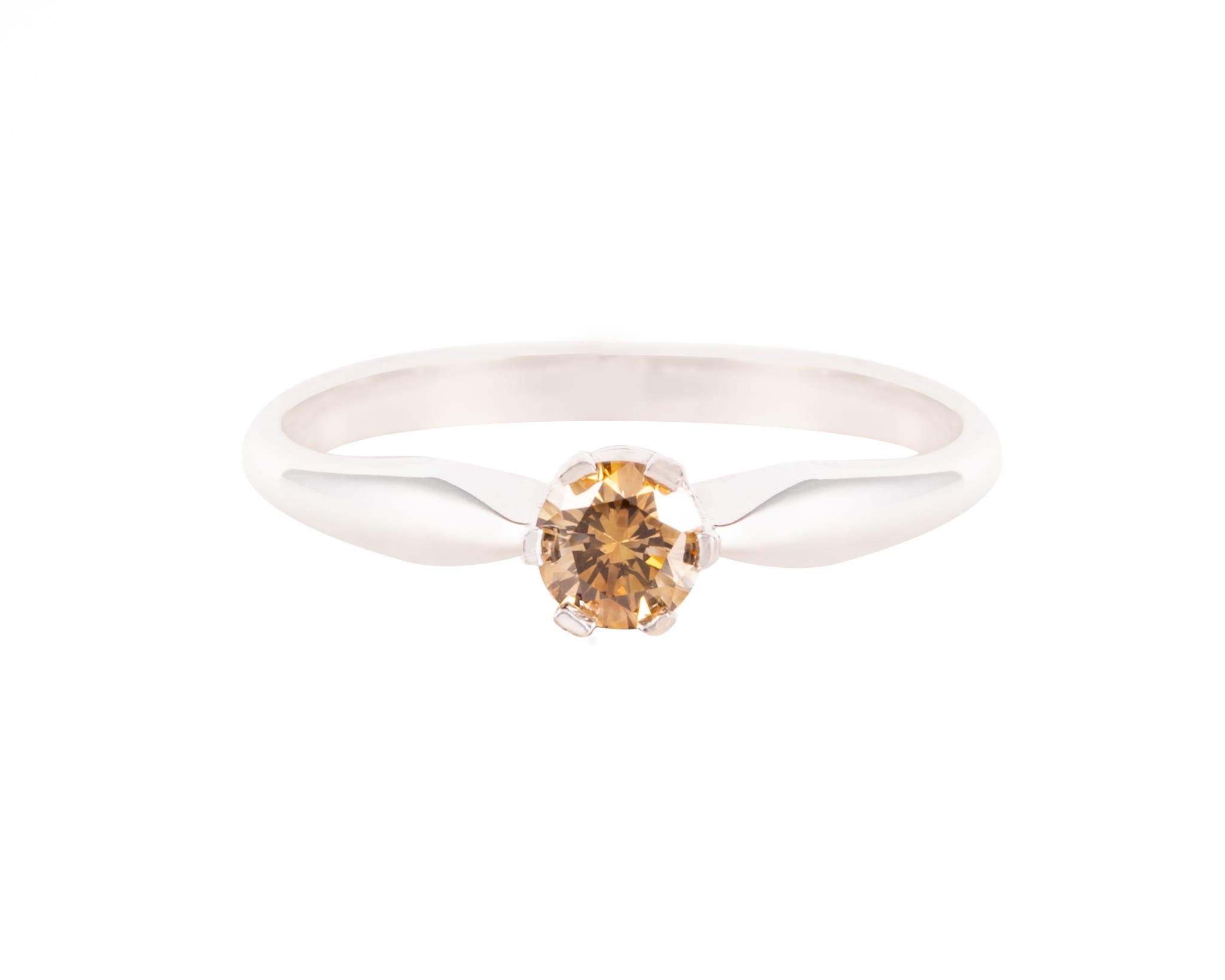 Pierścionek wykonany w białym złocie próby 585, z centralnie osadzonym diamentem o fantazyjnej barwie - pomarańczowo-żółtawo-brązowym, o masie ok. 0,28 karata, czystości VS.