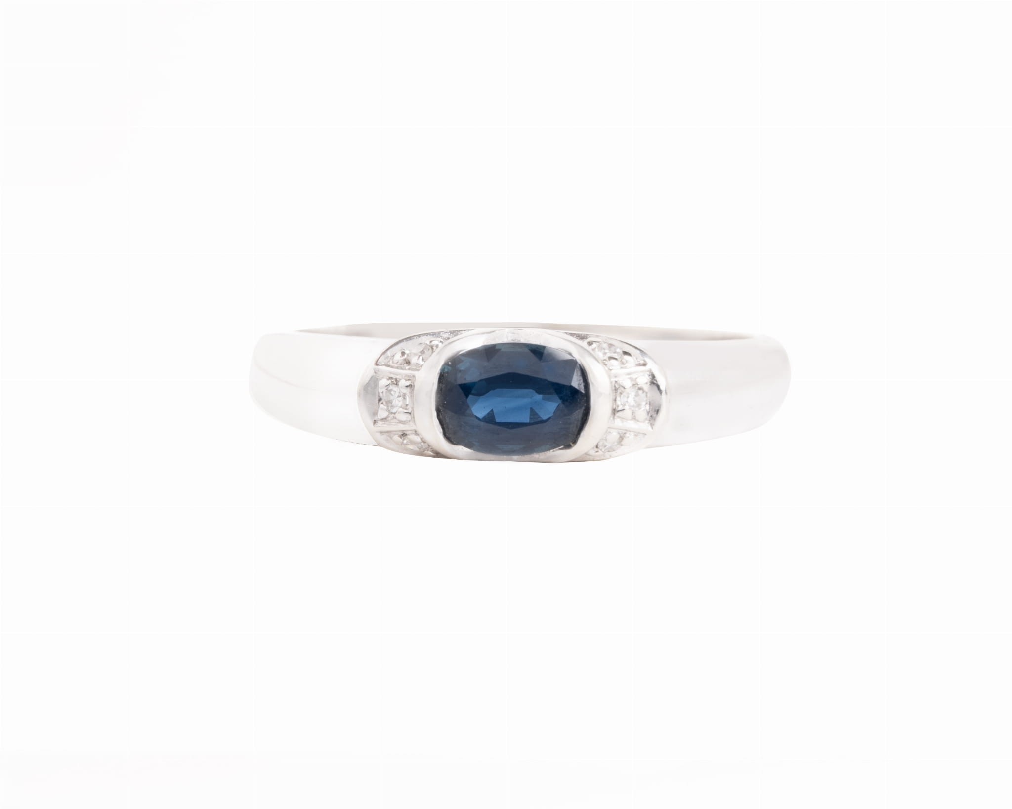 Pierścionek wykonany w białym złocie próby 3/585, z głównym kamieniem szafirem osadzonym w obrączce i 6 brylantami. Masa szafira to ok. 0,6 karata, a łączna masa brylantów to 0,05 karata.
