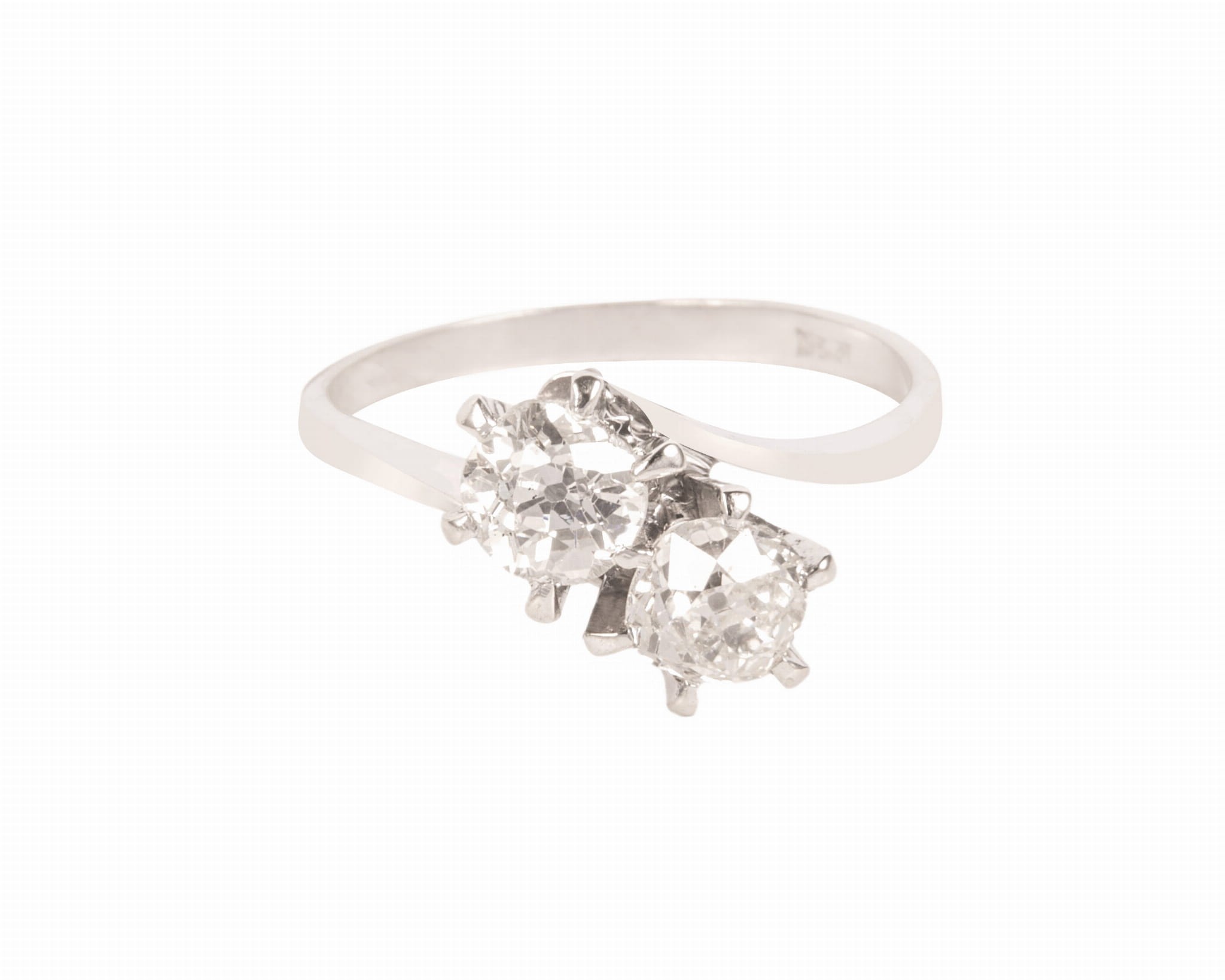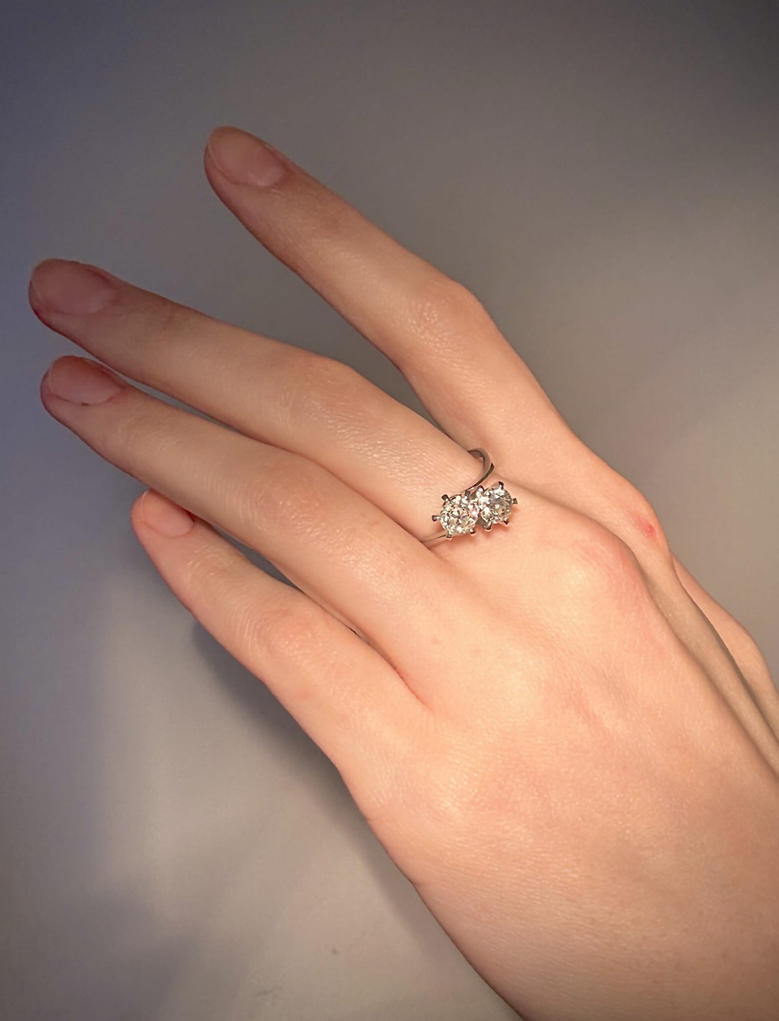 Pierścionek wykonany w białym złocie wysokiej próby 750, tj. 18 karatowe złoto, w typie "Toi et Moi" z dwoma diamentami o masie ok. 0,50 karata, czystości VS-Si oraz barwie J. Pierścionek ma rozmiar 13,5 (zapytaj o możliwość zmiany rozmiaru).