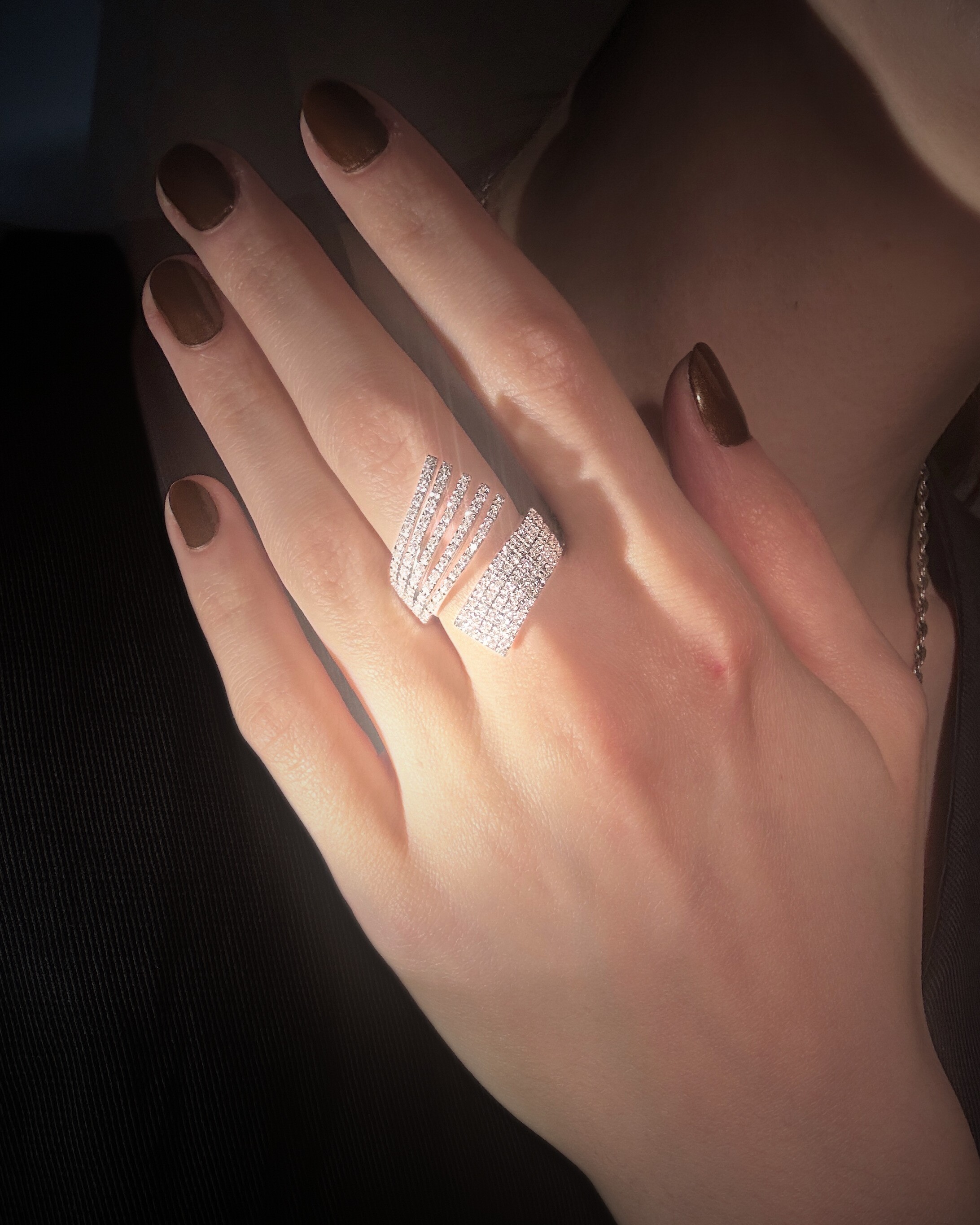 Pierścionek wysadzany diamentami, o niezamkniętej obrączce