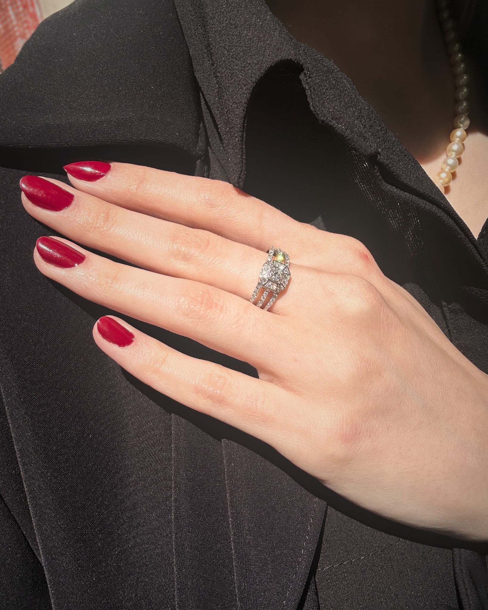 Pierścionek z diamentami o łącznej masie ok. 0,75 karata, w tym centralny diament ma ok. 0,15 karata, czystość VS i barwę G. Pozostałe 66 kamieni ma czystość Si, barwa H-I.