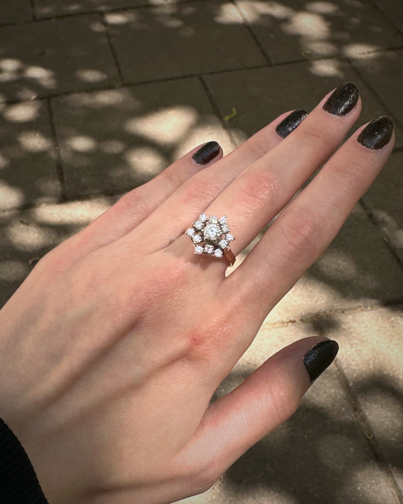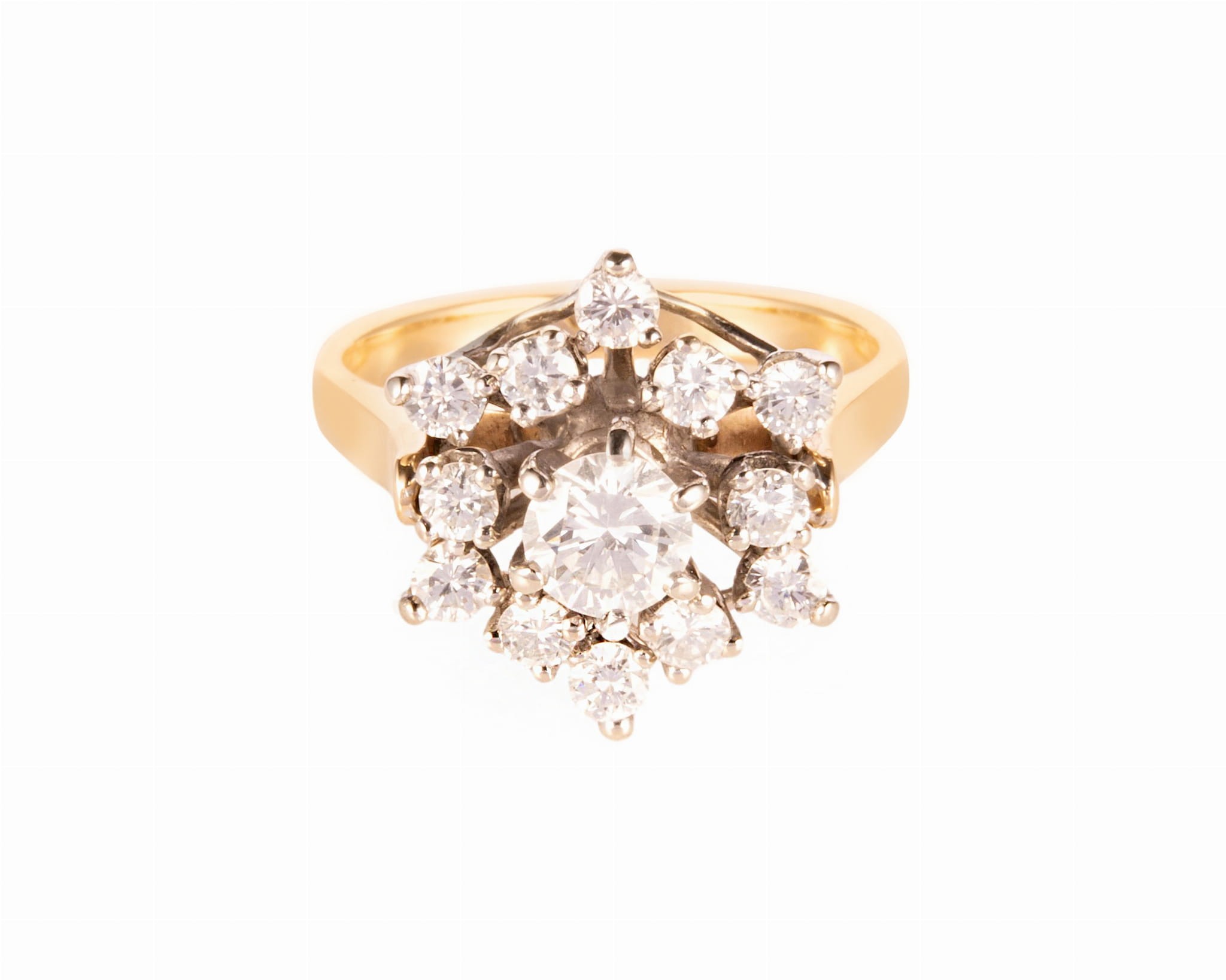 Złoty pierścionek z zakutymi symetrycznie diamentami, z największym umieszczonym centralnie o masie ok. 0,38 karata. Pozostałe 12 diamentów ma ok. 0,48 karata. Czystość kamieni to VS a ich barwa F-G. Całość wykonana w złocie próby ok. 540 - według świadectwa badania z Urzędu Probierczego.