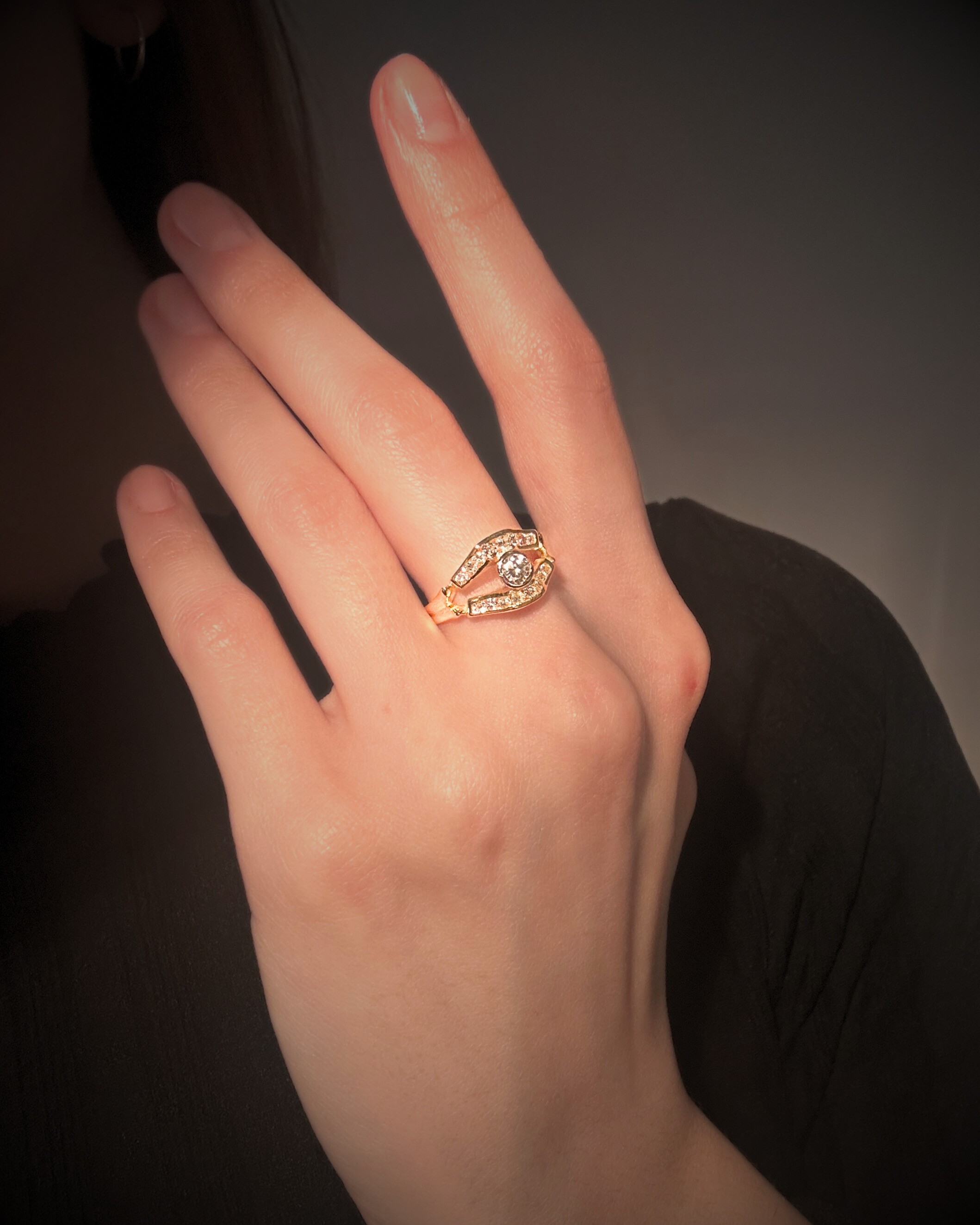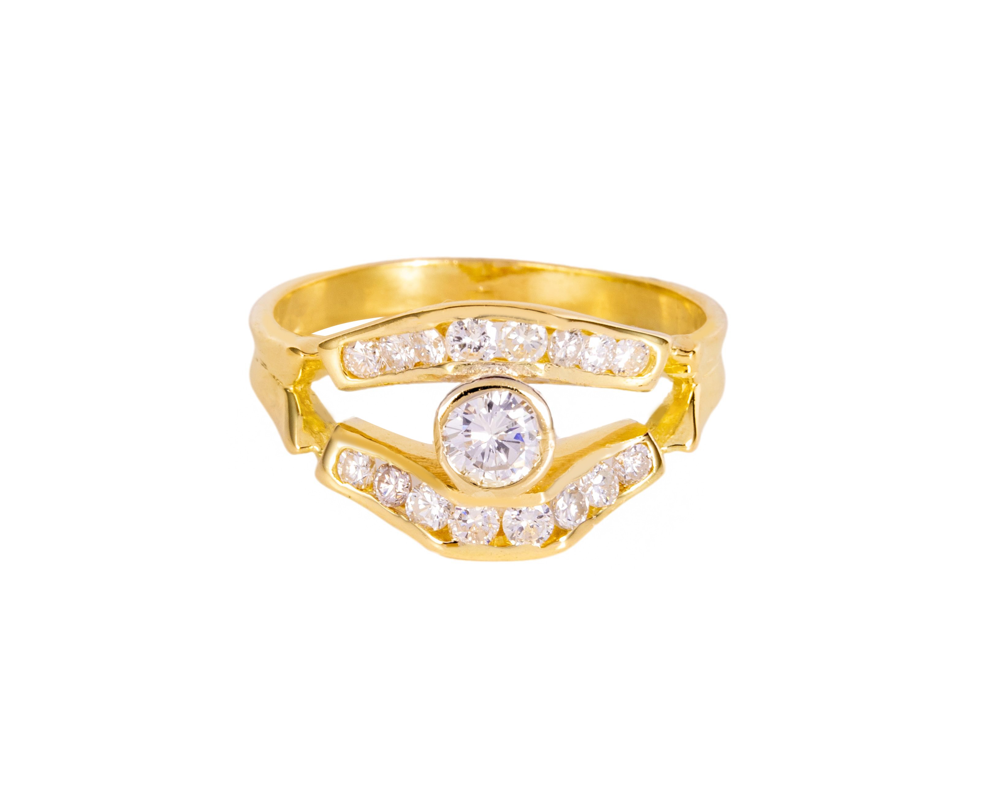 Pierścionek z ażurową górką i łącznie 17 diamentami. Całość wykonana ze złota próby 750, na rozmiar 14.