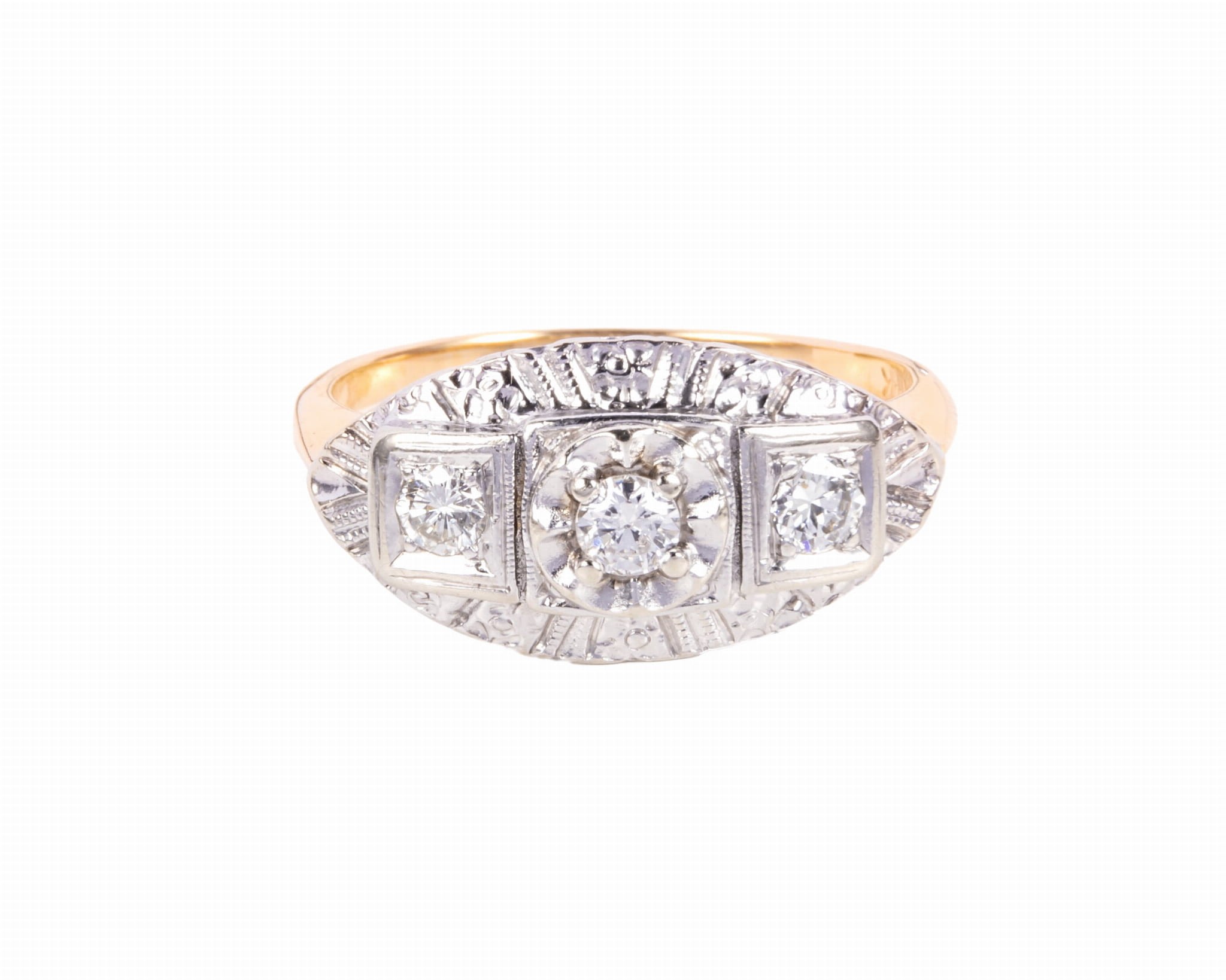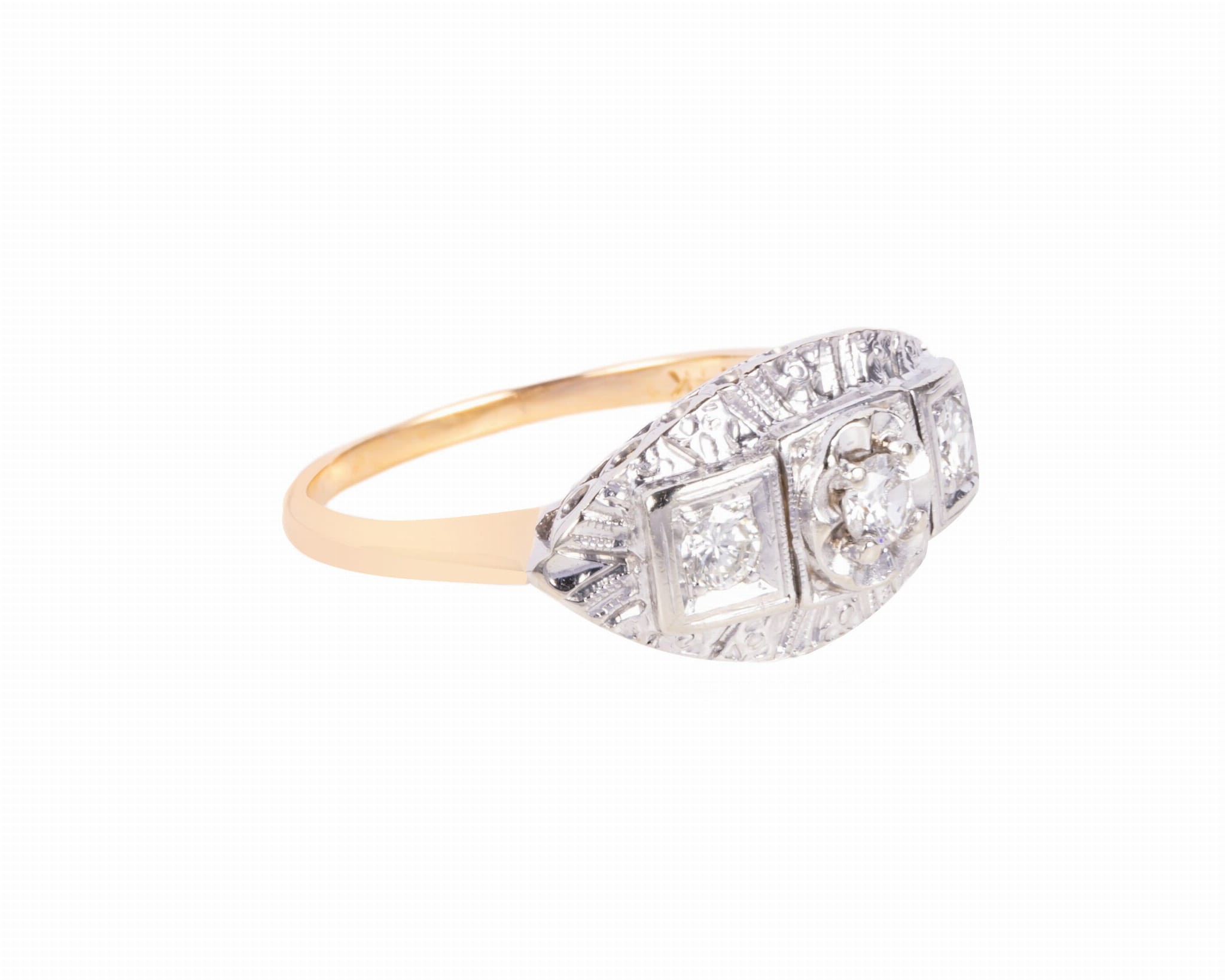 Pierścionek ze złota z szeroką, dekoracyjną oprawą kamieni, całość wykonana w złocie próby 3, tj. 585. Mamy tutaj 3 diamenty w brylantowym szlifie o łącznej masie ok. 0,30 karata, czystości VS oraz barwie G. Pierścionek ma rozmiar 17.