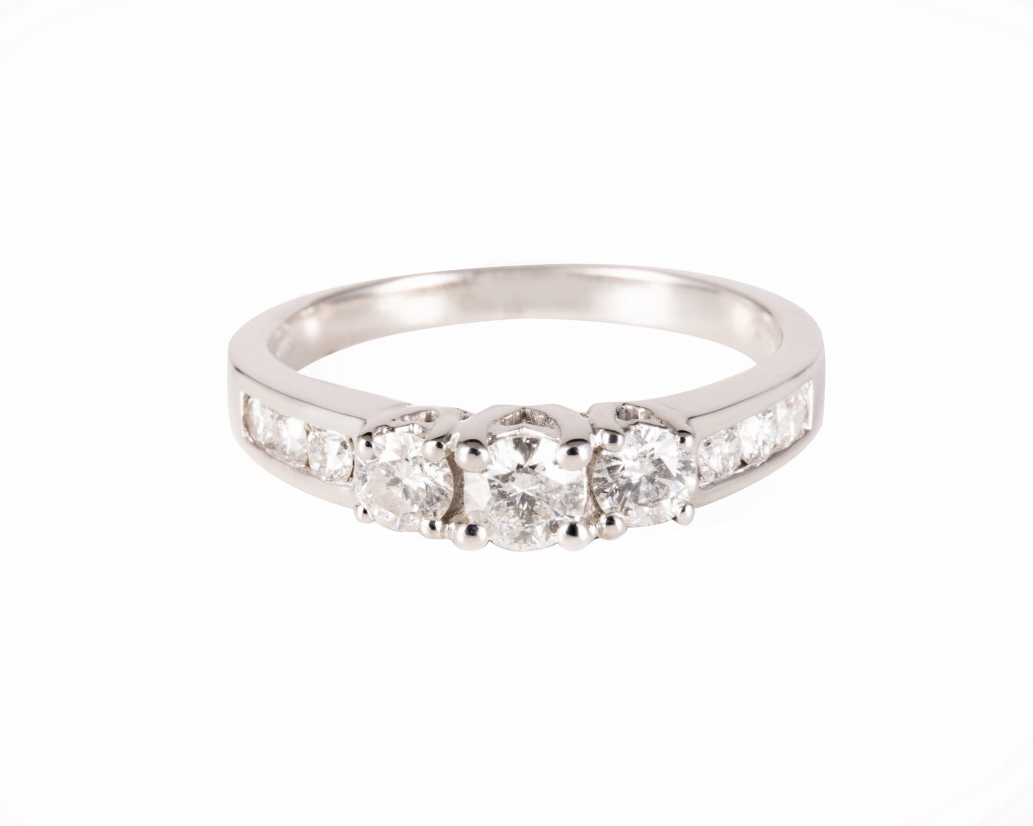 Piękny pierścionek wykonany w białym złocie próby 585, w który zakuto łącznie 9 diamentów - trzy główne, centralne kamienie oprawiono w łapki, pozostałe sześć symetrycznie osadzono bokach w szyny pierścionka. Łączna masa diamentów to 0,65 karatów, ich czystość to Si2-P2, a barwa G-H. Rozmiar pierścionka to 13.